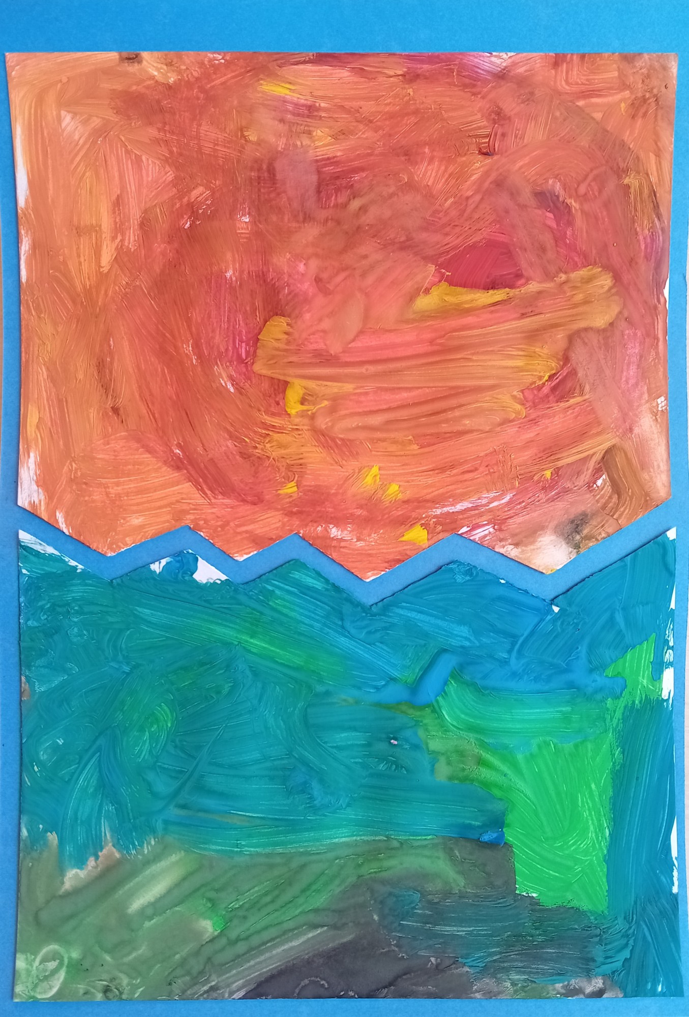 Vienā zīmējuma pusē attēlots mežš ar zaļu zāli un kokiem,otrā pusē attēlots smilšu kalns.