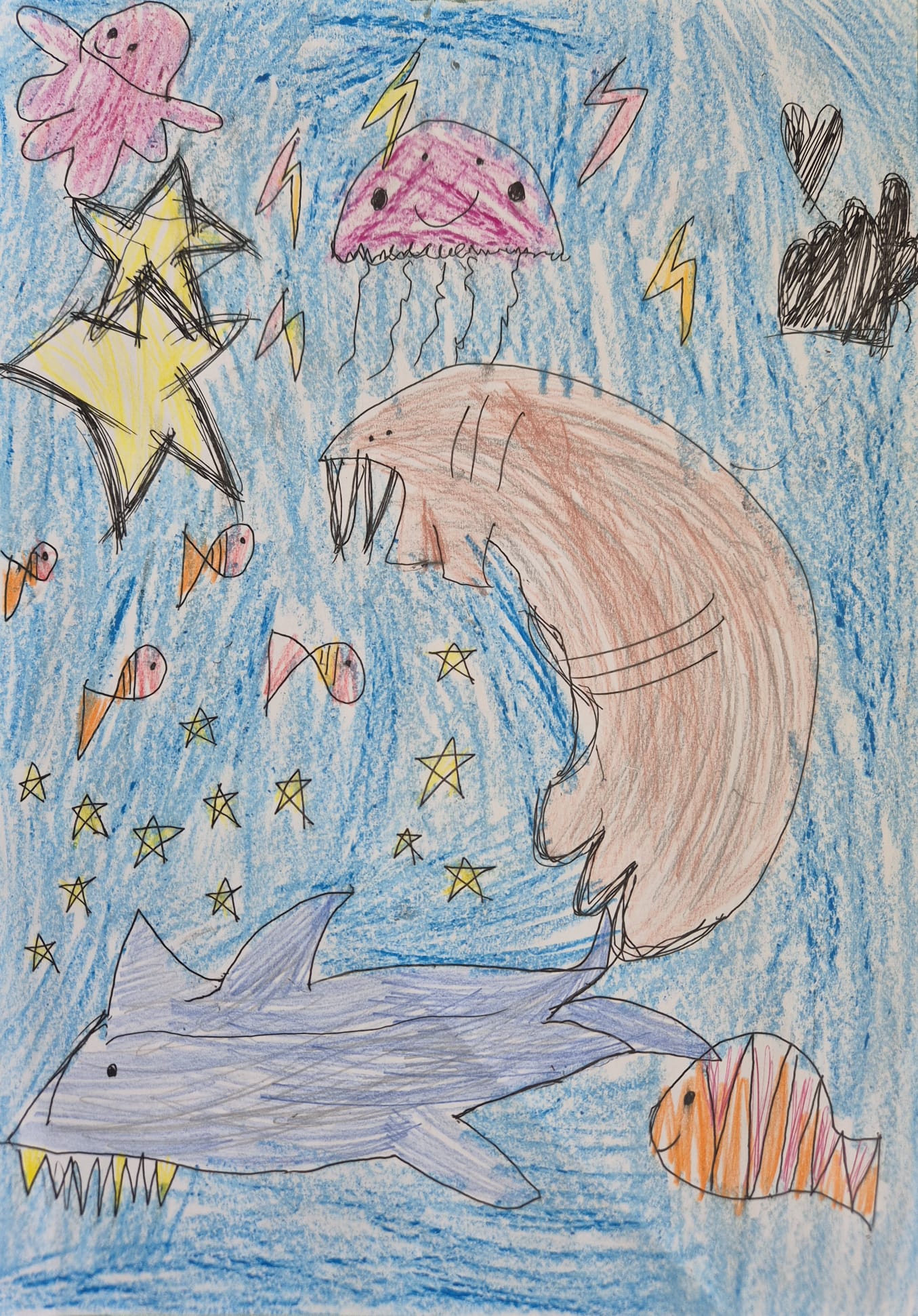 Manā zīmējumā ir redzama brīnišķīga ūdens pasaule. Ūdens ir mājas daudziem dzīvniekiem - tajā peld zivis, haizivs un medūzas, kā arī lielais valzirgs dzīvo ūdenī. Jūras dibenu rotā zvaigznes. Es gribēju parādīt, cik ūdens ir svarīgs, jo tas dod mājas un dzīvību daudziem dzīvniekiem.