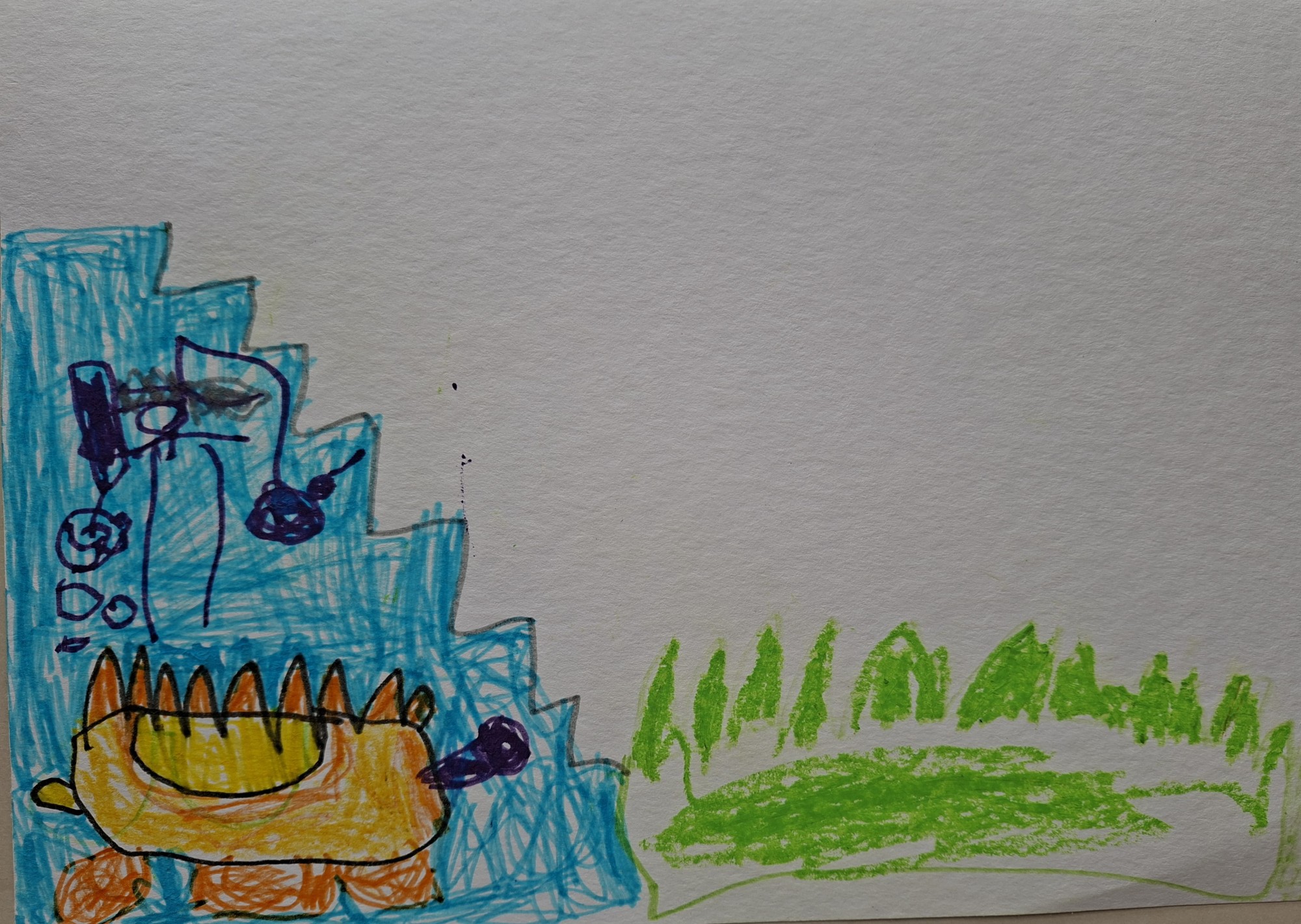 Ūdenī peld lielais bruņurupucis, viņš ir priecīgs. Blakus ūdenim aug zaļa zālīte. Viss ir tīrs.