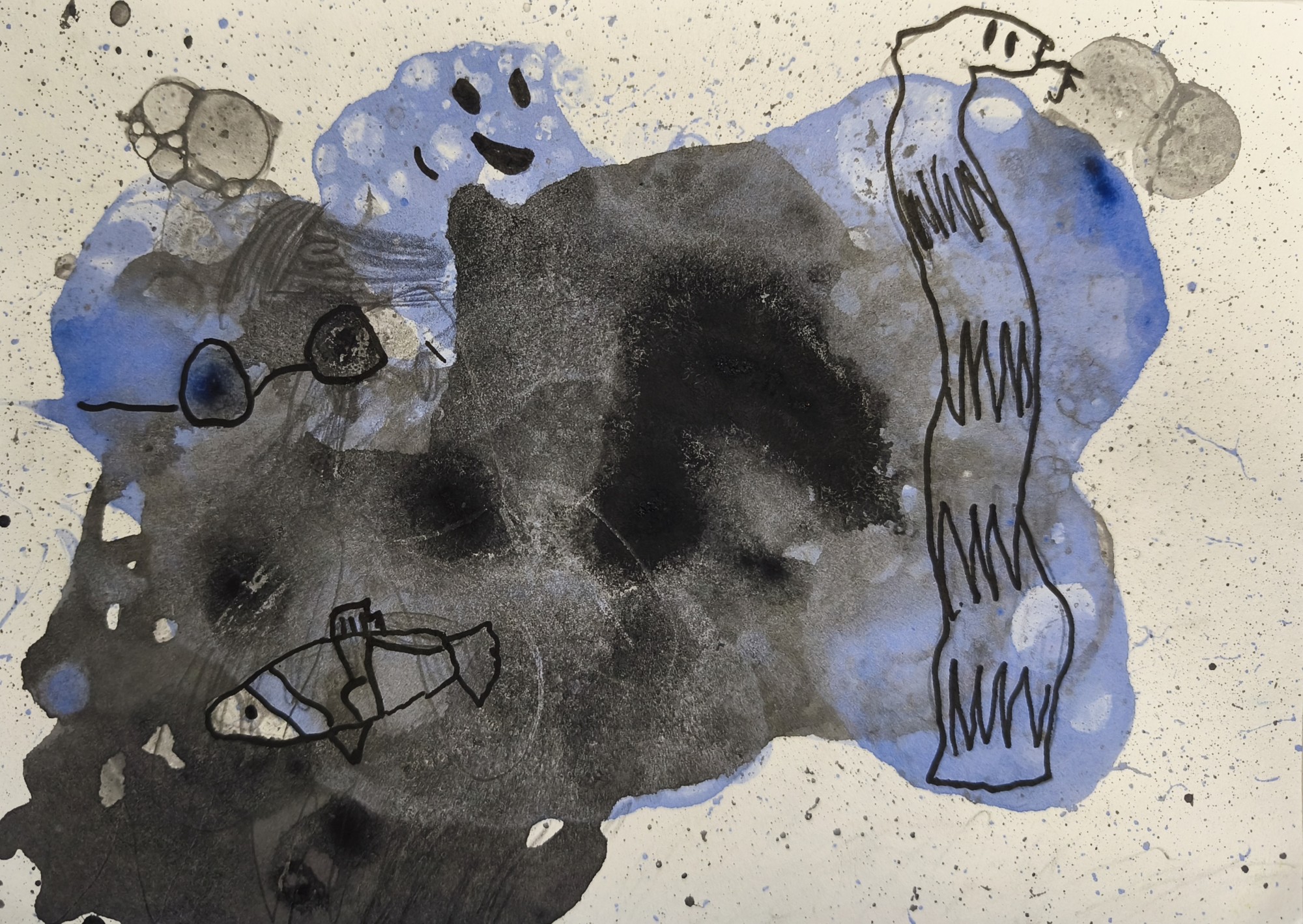 Darbs veidots pūšot guašas / Fairy burbuļus, papildinot ar grafisku zīmējumu.