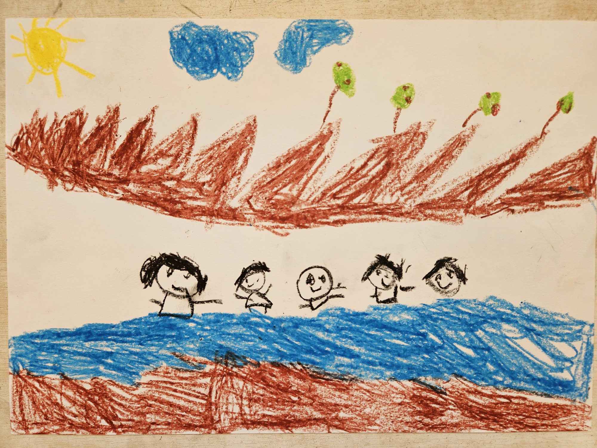 Saulaina diena, brūnā krāsā ir upes krasti, upē peld bērni.