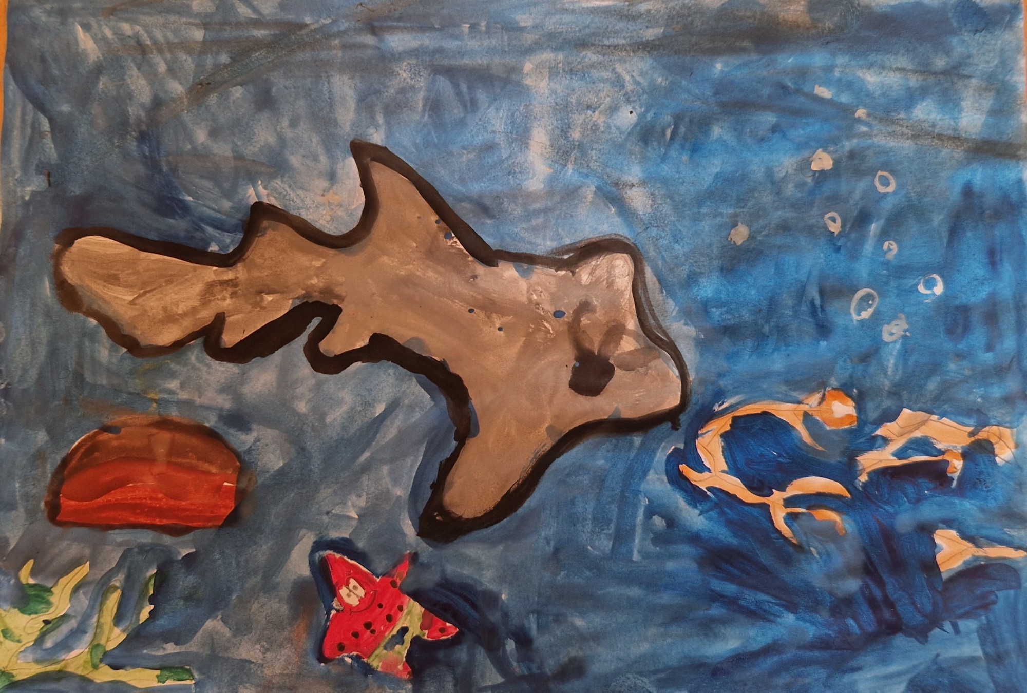 Bērna stāstījums par darbu: ūdens ir vajadzīgs, lai lielajos okeānos varētu peldēt gan cilvēki, gan dzīvot dažādas radības, arī haizivīm tur ir sava māja.