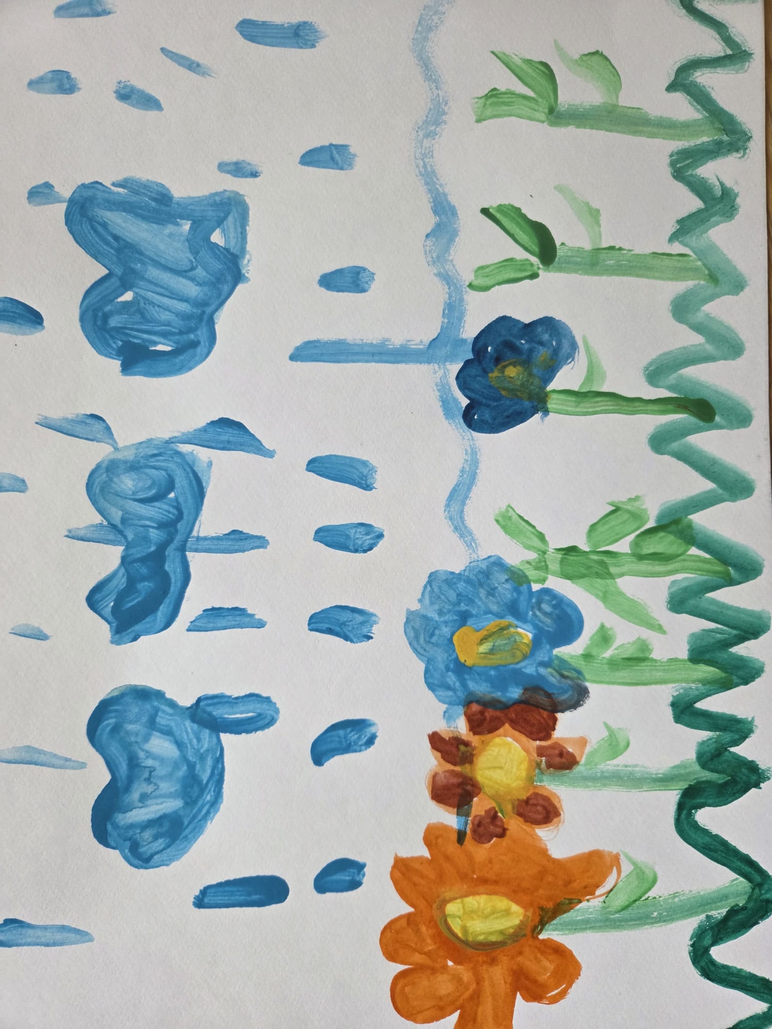 Lietus, mākoņi, puķes.