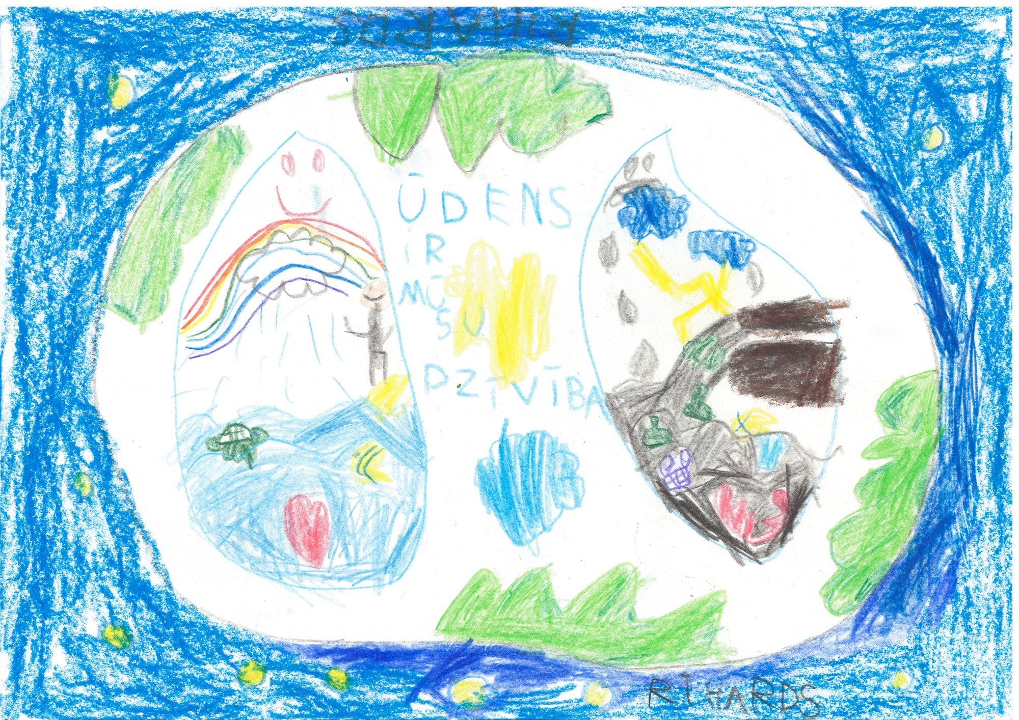 Šajā zīmējumā bērns atklāj ūdeni kā dzīvu un jūtīgu dabas daļu, kurai var būt divas sejas: priecīga un skumja. Savā darbā bērns attēlo kontrastu starp tīru, dzīvību dodošu ūdeni un piesārņotu, apdraudētu vidi.