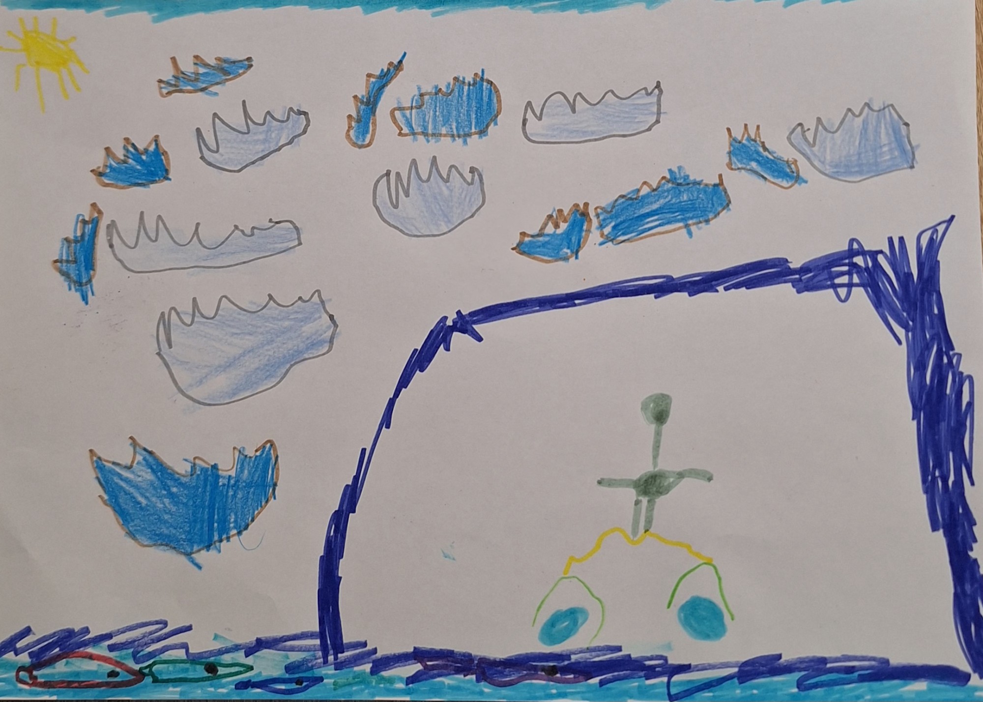 Zīmējums zīmēts ar flomasteriem.Zīmējumā attēlota jūra, kurā brauc ar ūdensmoci.