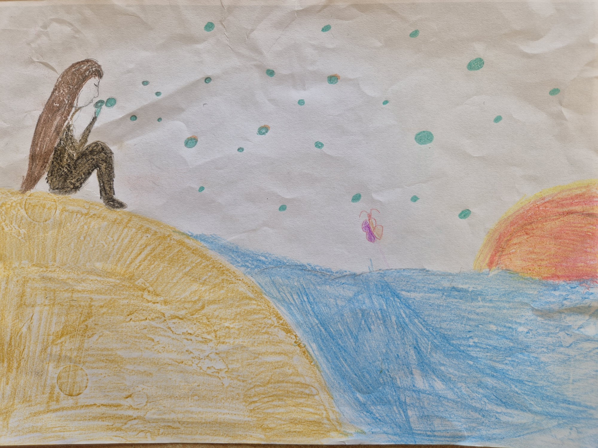 Zīmējumā attēlota Liliāna, kura sēžpie jūras un pūš burbuļus.