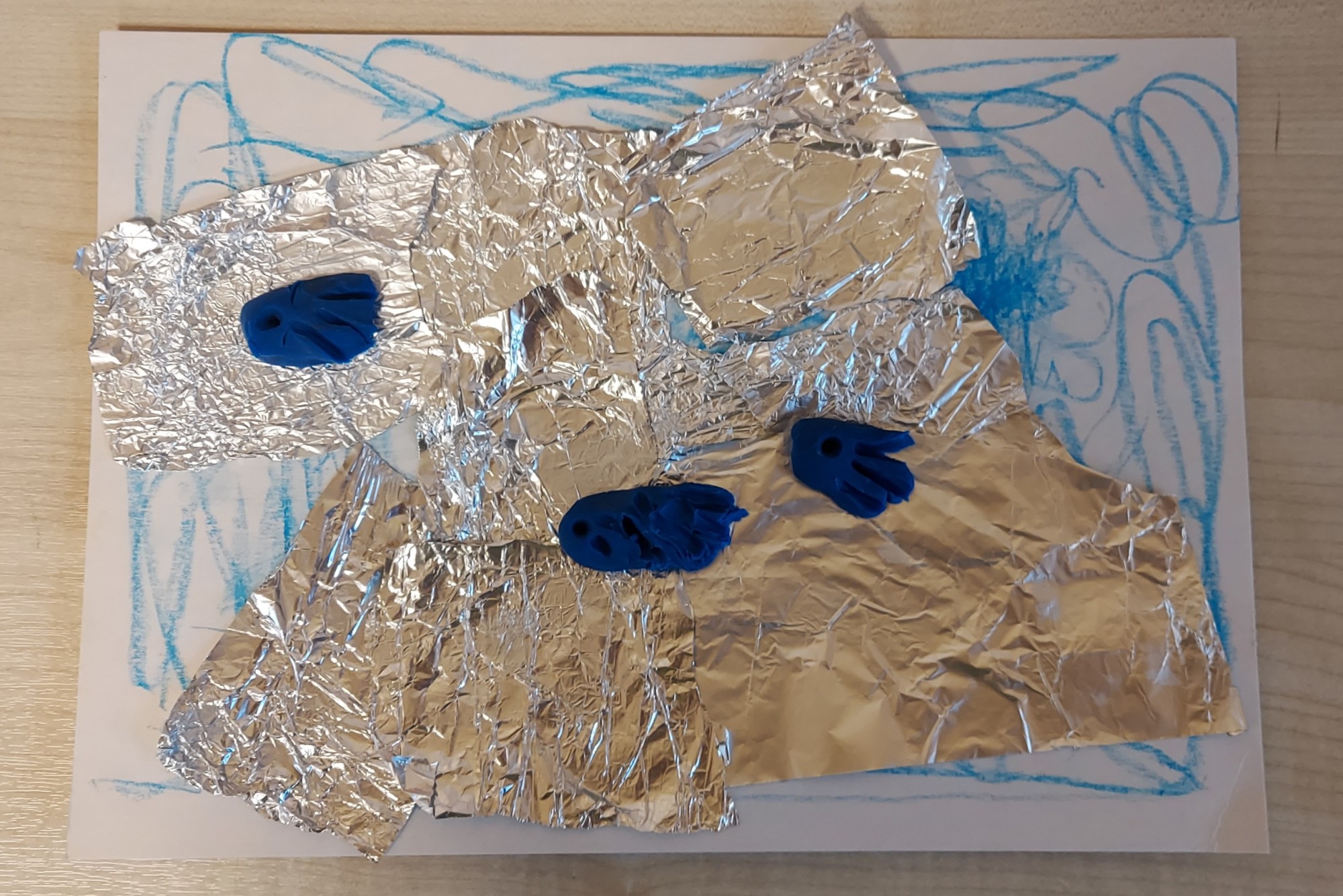 Kopumā darbs kā aplikācija ar veidošanas elementiem : zīmējumā, folijas un plastilīna apvienojums rada interesantu, telpisku un nedaudz pasakainu zemūdens pasauli.