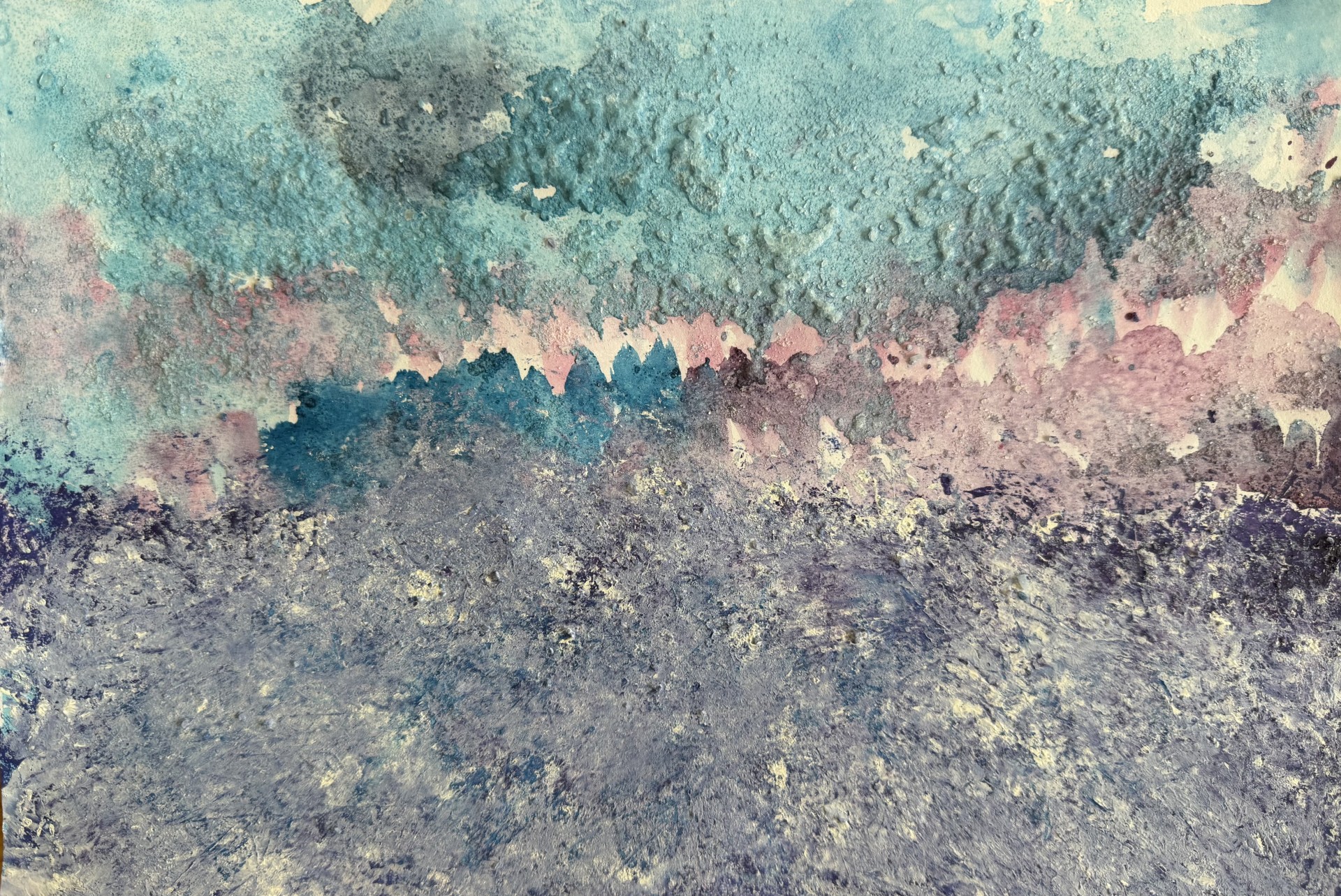 Darbs izpildīts ar akvareļkrāsām, guašu, avīzi, sāls.