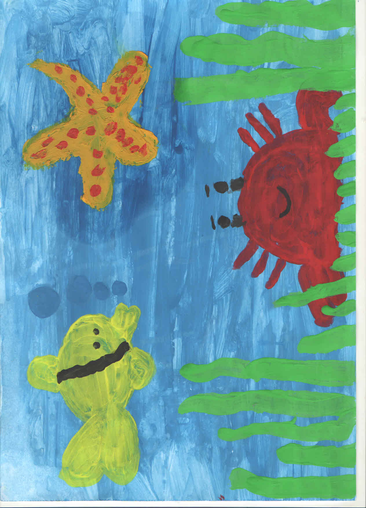 Es uzzīmēju zivi, krabi un jūras zvaigzni, kas dzīvo ūdenī.