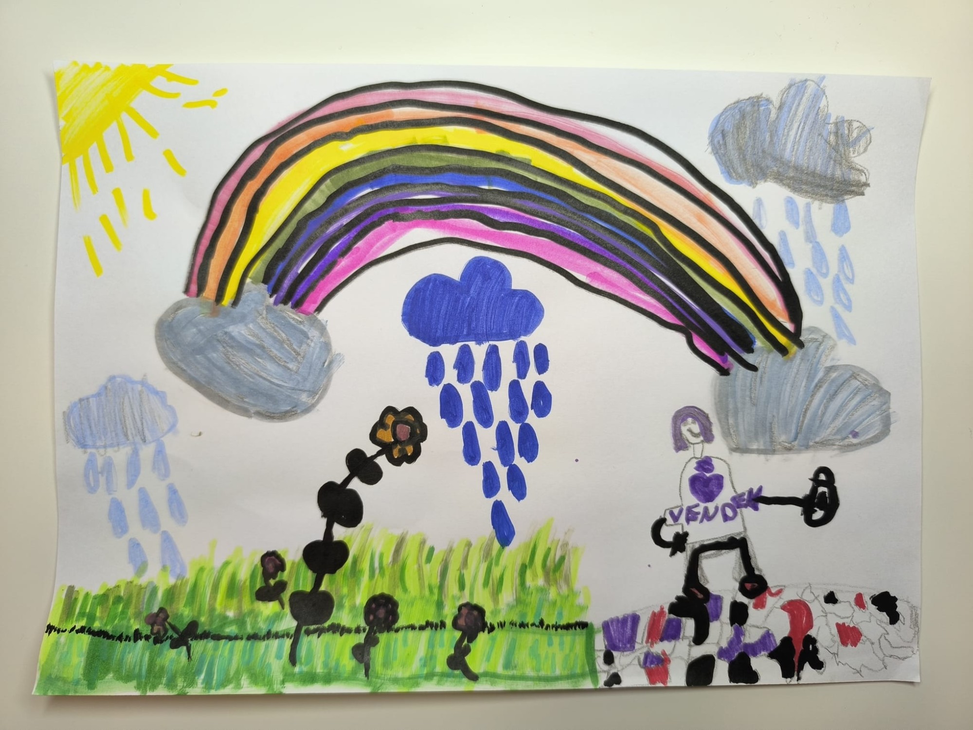 Šodien debesis bija gan saulainas, gan lietainas, un tāpēc debesīs parādījās ļoti skaista varavīksne. Zem tās auga puķītes un zaļa zālīte, un viss izskatījās kā maģiska pasaka. Meitene Vendi stāvēja malā un priecājās, jo viņai likās, ka varavīksne sargā visu pļavu. Man šķiet, ka šajā zīmējumā daba smaida un saka, ka pēc lietus vienmēr atnāk kaut kas skaists.