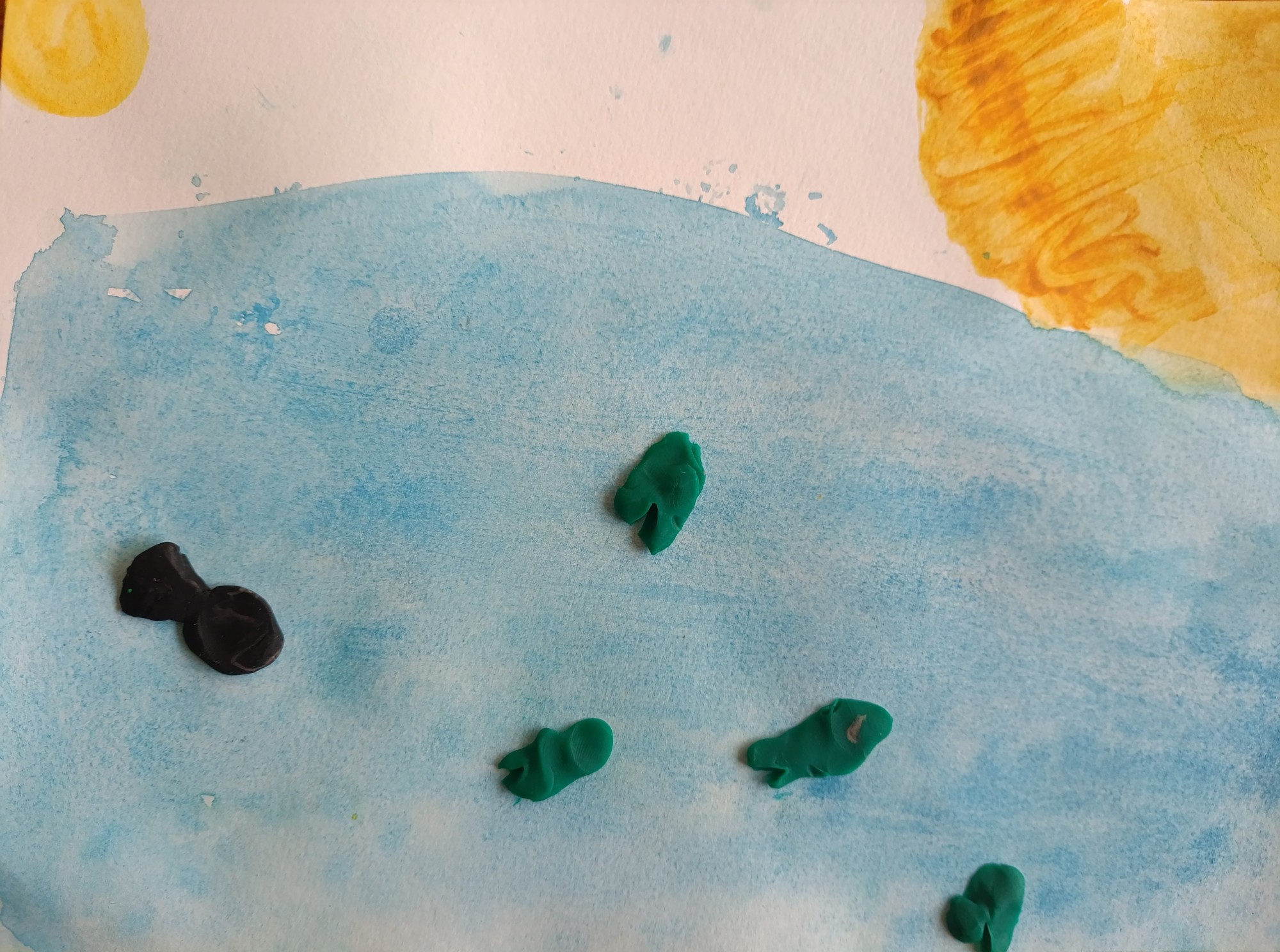 Šajā zīmējumā ir saule, jūra un zivis. Ūdens ir ļoti svarīgs, jo zivis dzīvo jūrā un saule padara ūdeni skaistu un spožu.