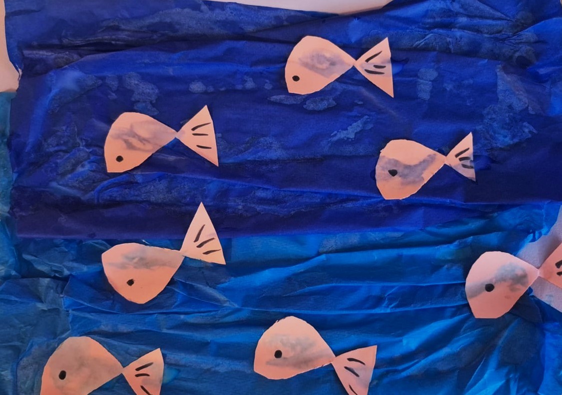 Mazas zivtiņas peld zilajā ūdenī un draudzīgi dzīvo kopā jūrā.