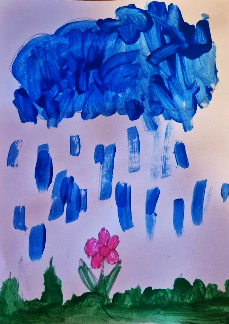 No mākoņa līst lietus, kas palīdz ziediem un zālei augt.