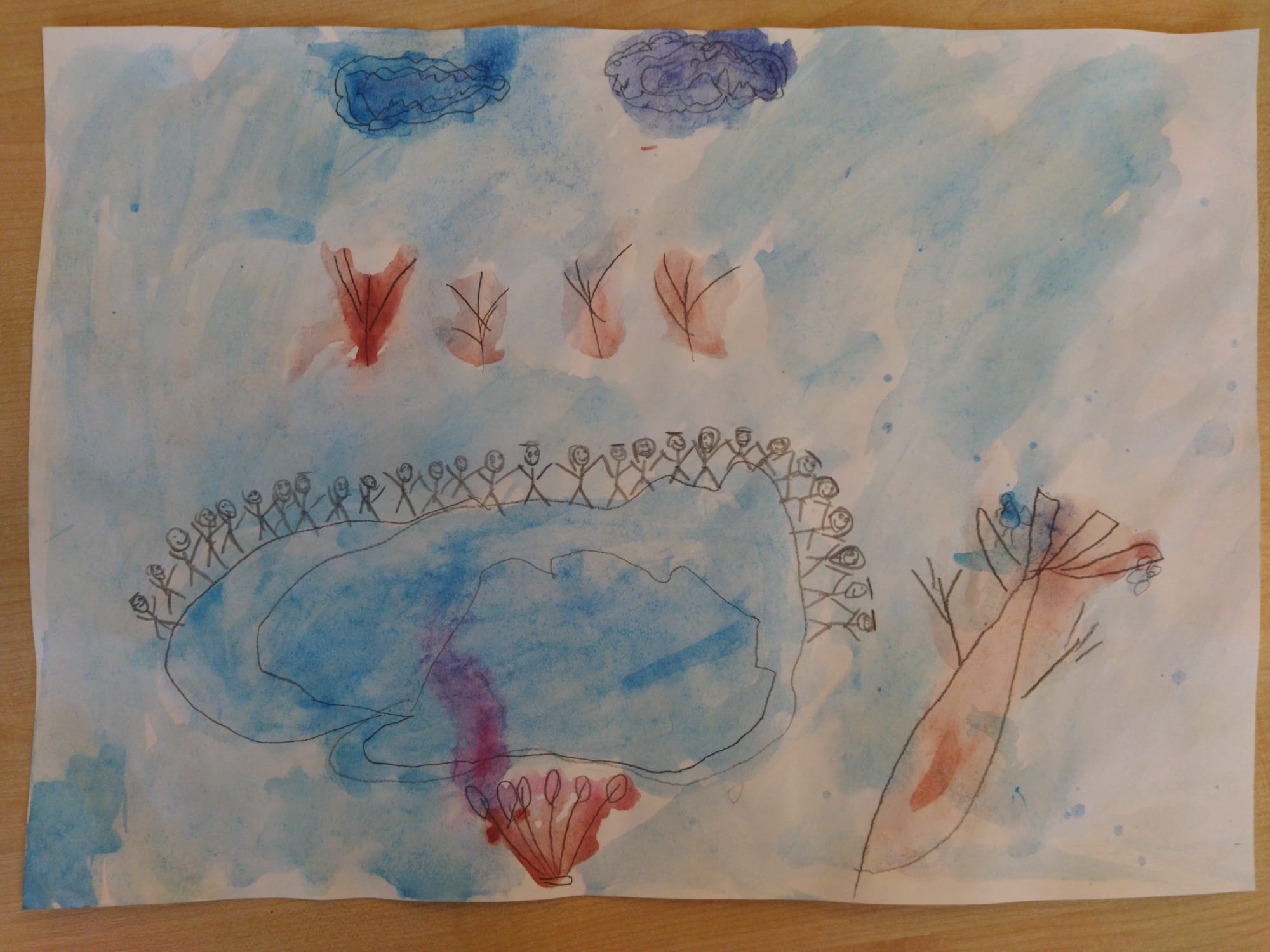 Divi bērni stāv pie aizsalušas upes un skatās uz ledu.