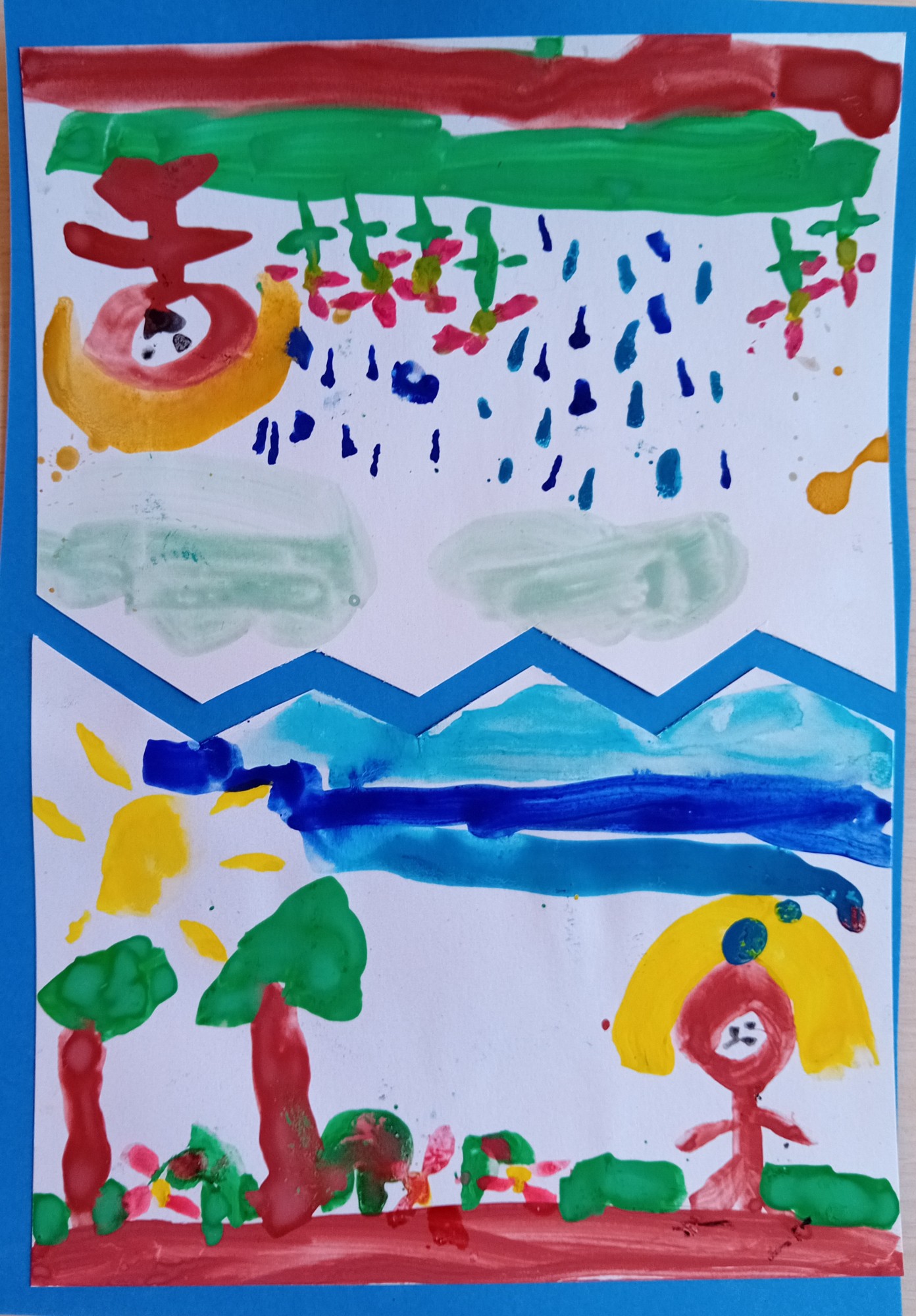Zīmējuma vienā pusē attēlota meitene,kura priecājas par savām skaistajām puķēm lietus laikā,otrā pusē attēlota bēdīga meitene,jo viņas puķes bez ūdens nevar uzziedēt.