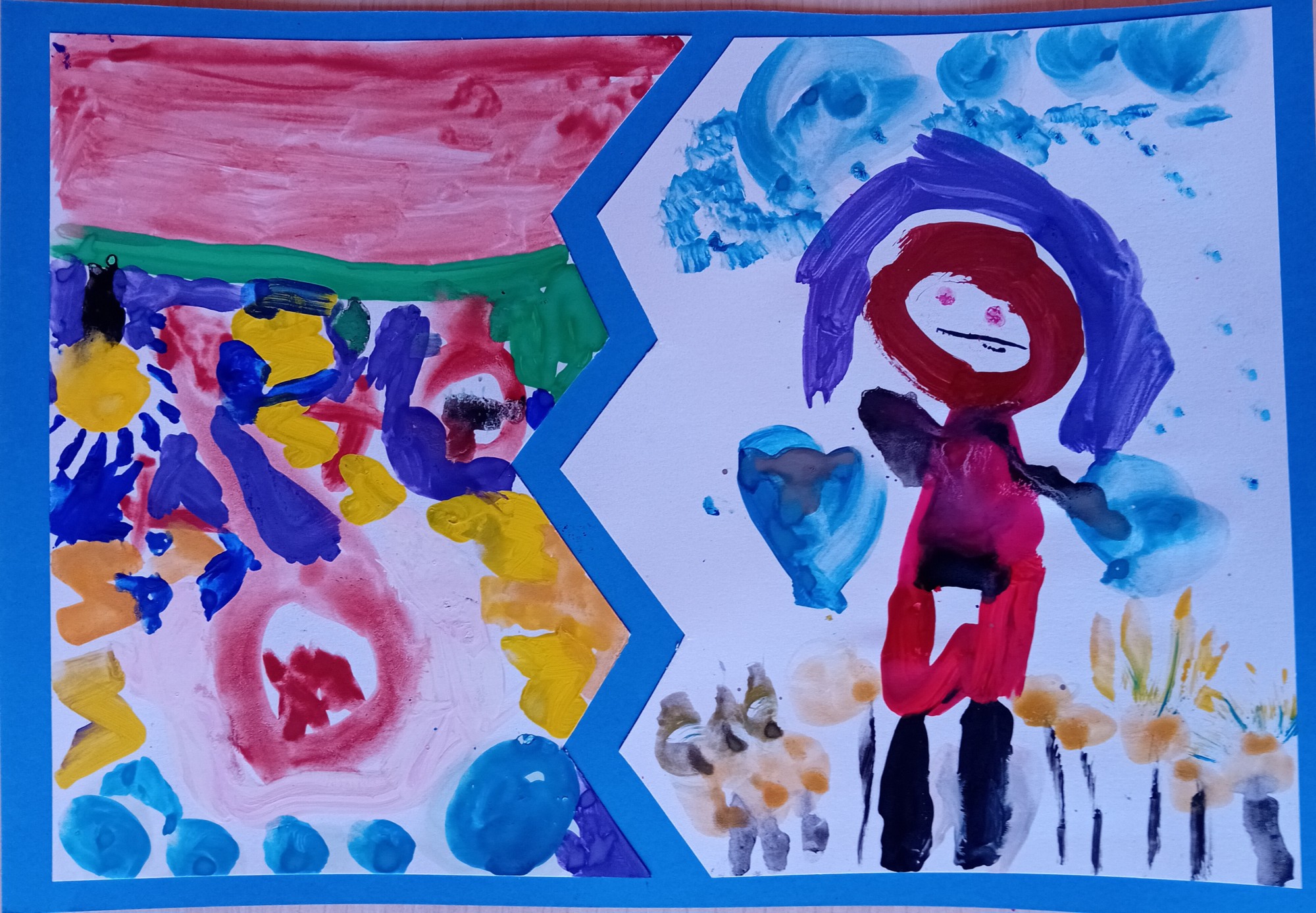 Zīmējuma vienā pusē attēlotā meitene ir bēdīga,jo viņas puķes bez ūdens ir novītušas,otrā pusē - uzlija lietus un puķes uzziedēja