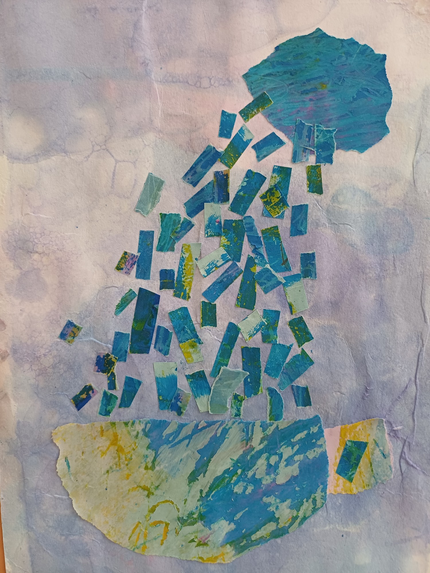 Zilie un zaļie toņi simbolizē tīrību, svaigumu un dabas spēku. Darbs parāda , ka ūdens nāk no dabas un nepieciešams, lai viss augtu un Dzīvotu.