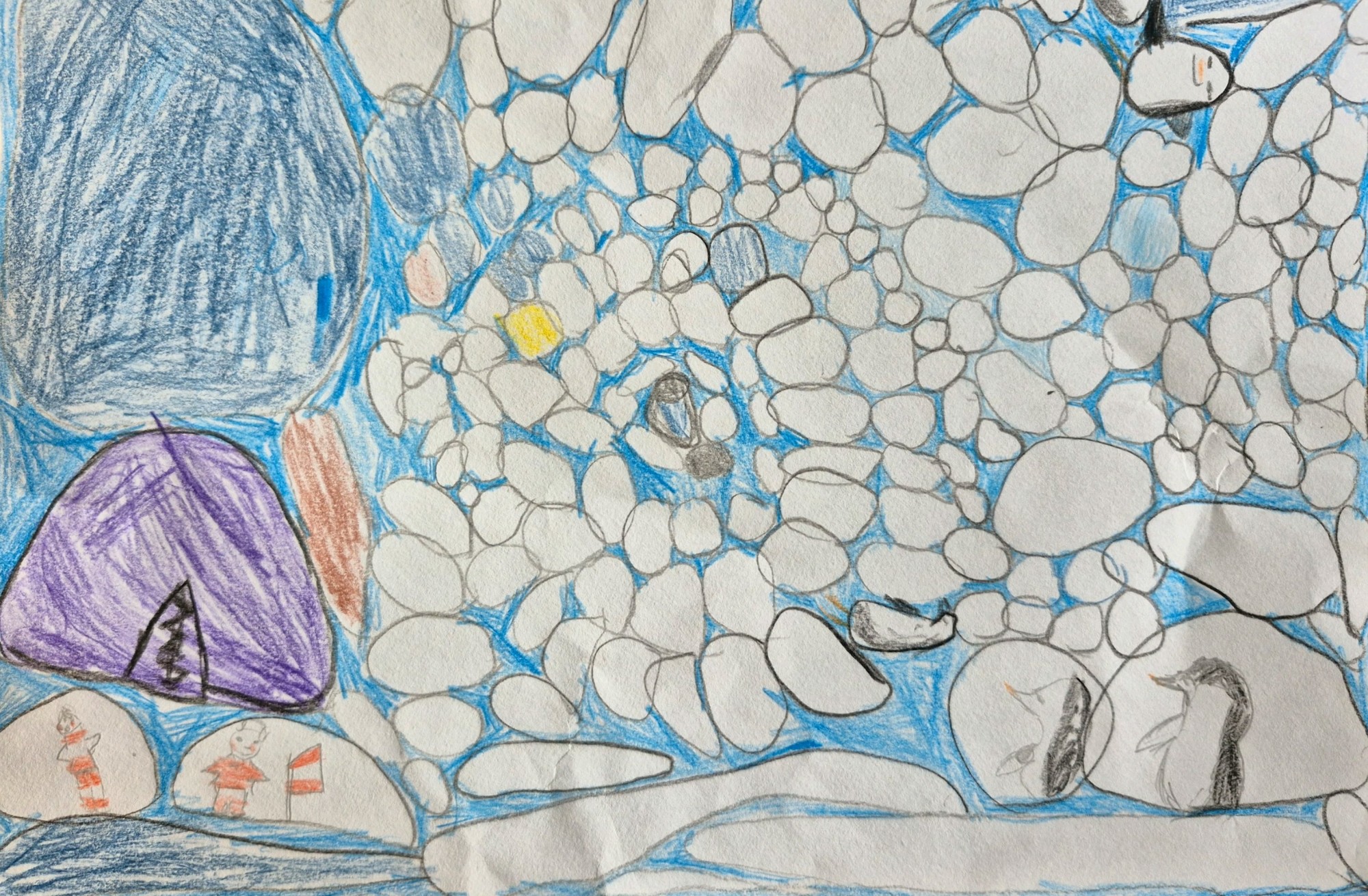 Zīmējumā ir redzami daudz mazi ledus gabali, kuri ir "noplīsuši" no lielā ledus gabala. Uz ledus un ūdenī ir pingvīni. Ir redzami arī divi cilvēki ar Latvijas karogu, viņiem blakus ir telts, kurā viņi dzīvo. Tur viņi pēta pingvīnus un viņu dzīvi.