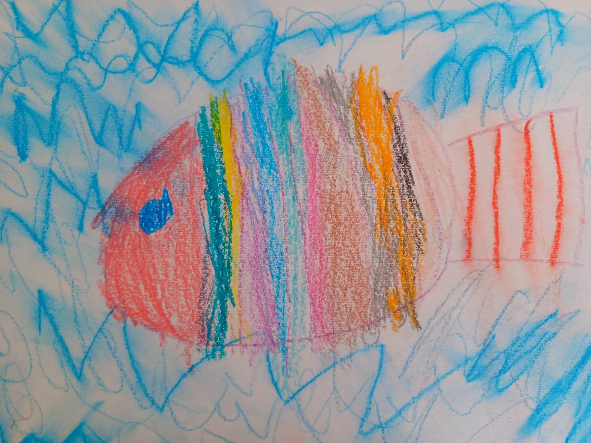 Darbs izpildīts ar vaska un pasteļkrītiņiem.