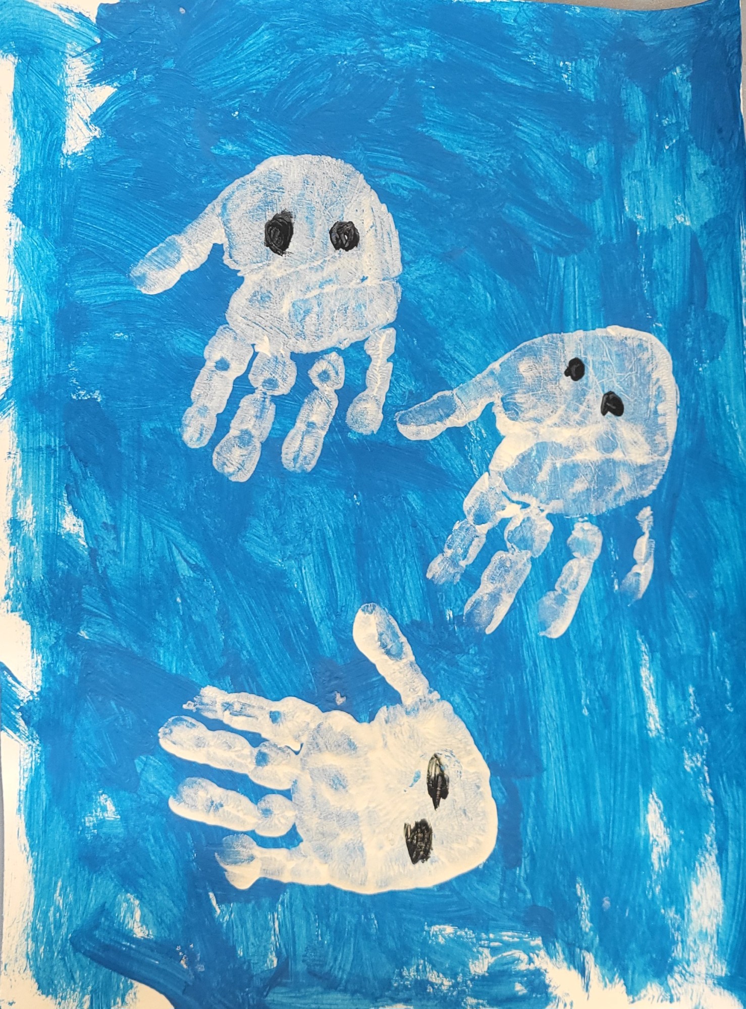 Ar guaša krāsu noklāts pamats - jūra. Ar krāsu palīdzību noklātas plaukstiņas un uzspiestas uz pamata - medūzas.