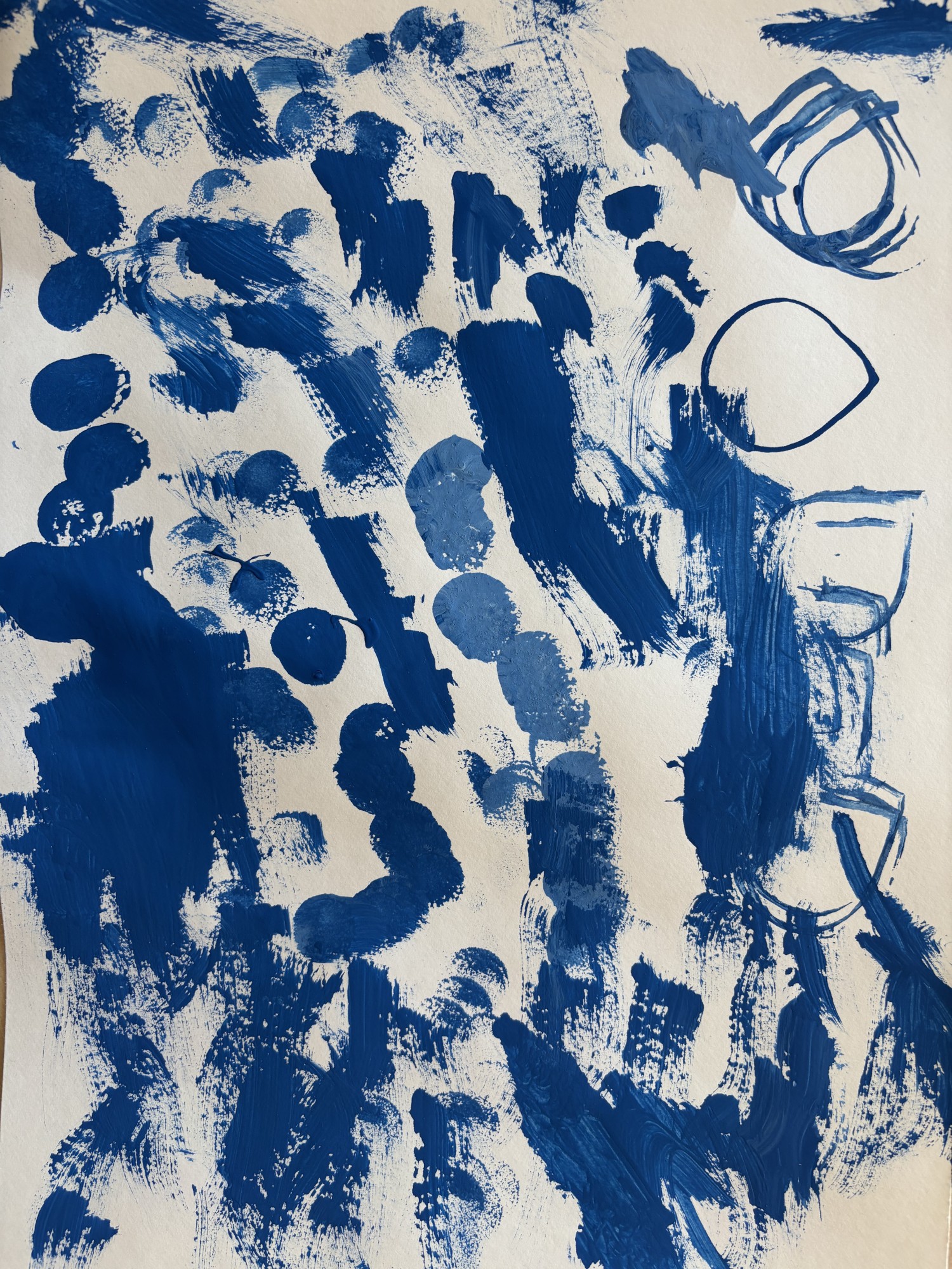 Bērns, izmantojot guaša krāsas, attēloja ūdens virpuli un kustību. Izmantojot otu, tualetes papīra rullīti un švammes otiņu, radītas dažādas līnijas un nospiedumi, kas simbolizē ūdens plūdumu un virpuļošanu.