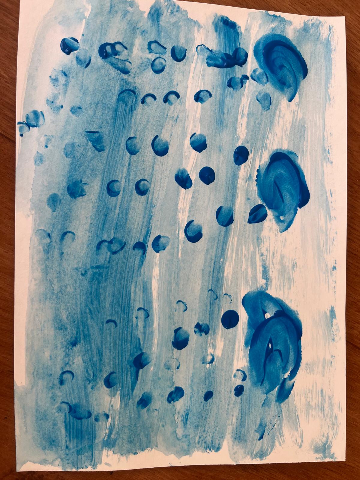 Darbā izmantota guaša krāsu fonam (klāta ar otu) un pirkstu krāsu tehniku lietus pilienu un mākoņu atveidošanai.