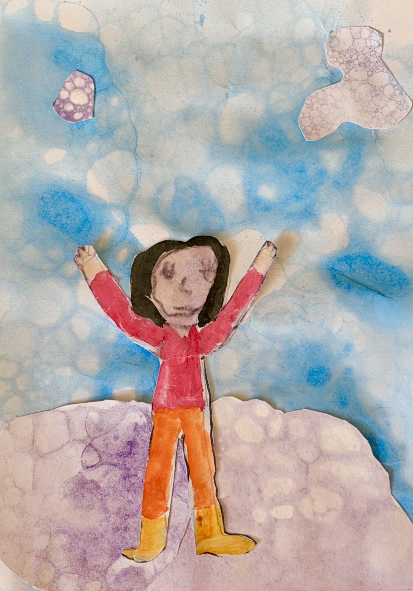 Bērns ar paceltām rokām sveicina debesīs peldošos ūdens burbuļus. Gaiss ir pilns prieku un rotaļām.