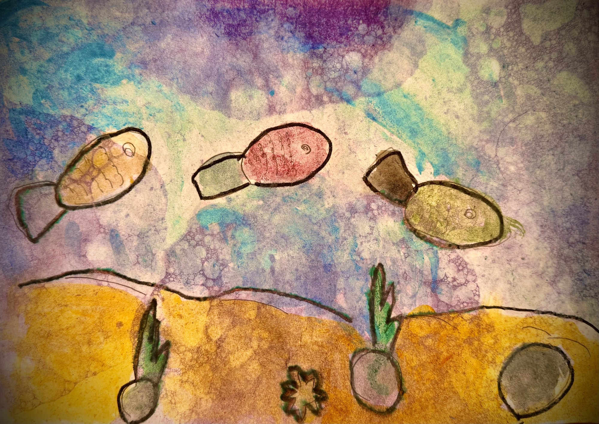 Zem ūdens dzīvo krāsainas zivis, kas mierīgi peld savā pasaulē. Ūdenī virpuļo burbuļi, kas rada noslēpumainu zemūdens pasauli.
