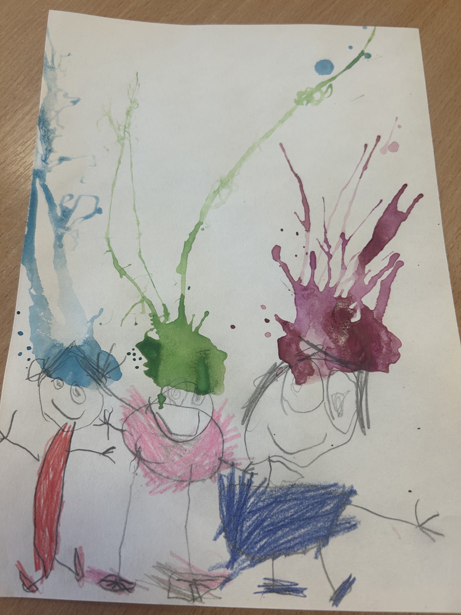 Izmantojot ūdeni un ūdens krāsas ( akvareļu krāsas) izpūtām ar salmiņu saviem zīmētiem cilvēciņiem matus.