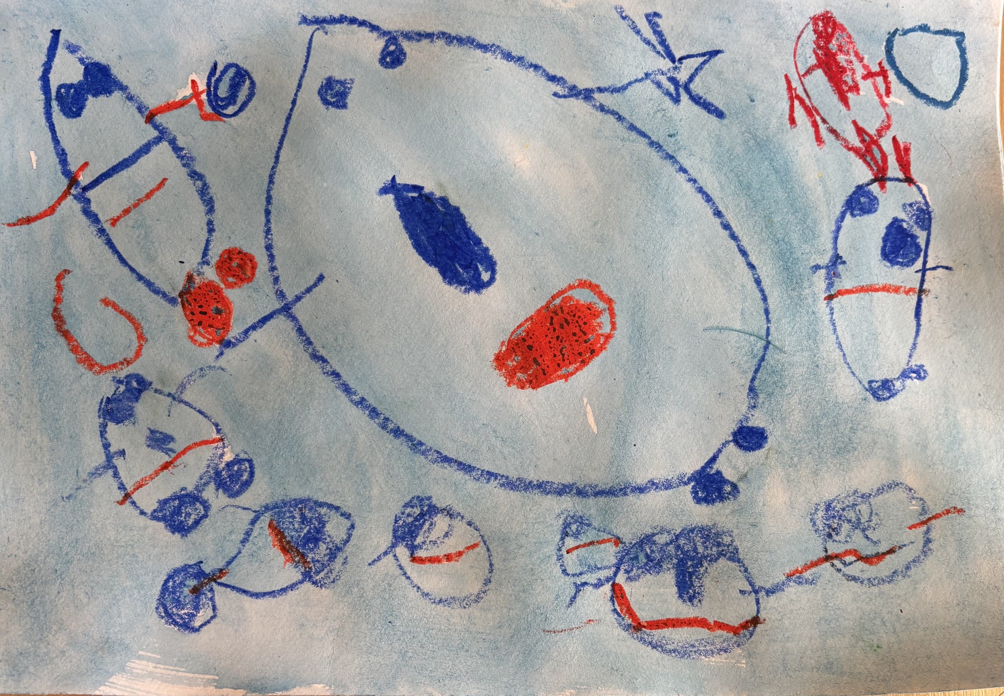 Ūdens pilītes draudzējas. Viņām paīk ka ir viss tīrs. Darbs zīmēts ar vaska krītiņiem un akvateļu krāsām.