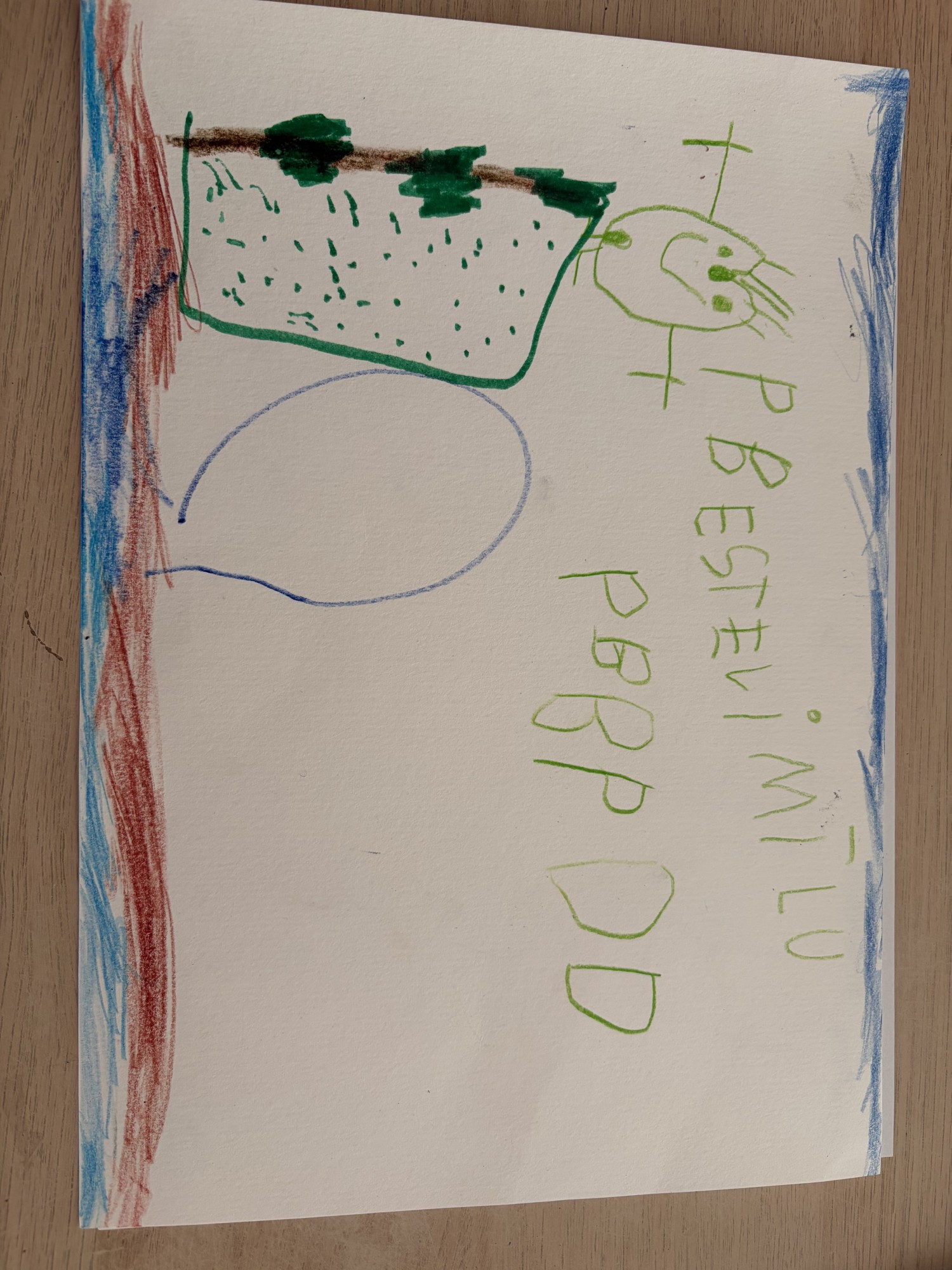Zīmējumā attēlota priecīga sirsniņa, kura sēž uz koka un priecājas par to, ka tā dzīvo pasaulē ar ūdeni un tieši tāpēc tā var būt tik augstu.