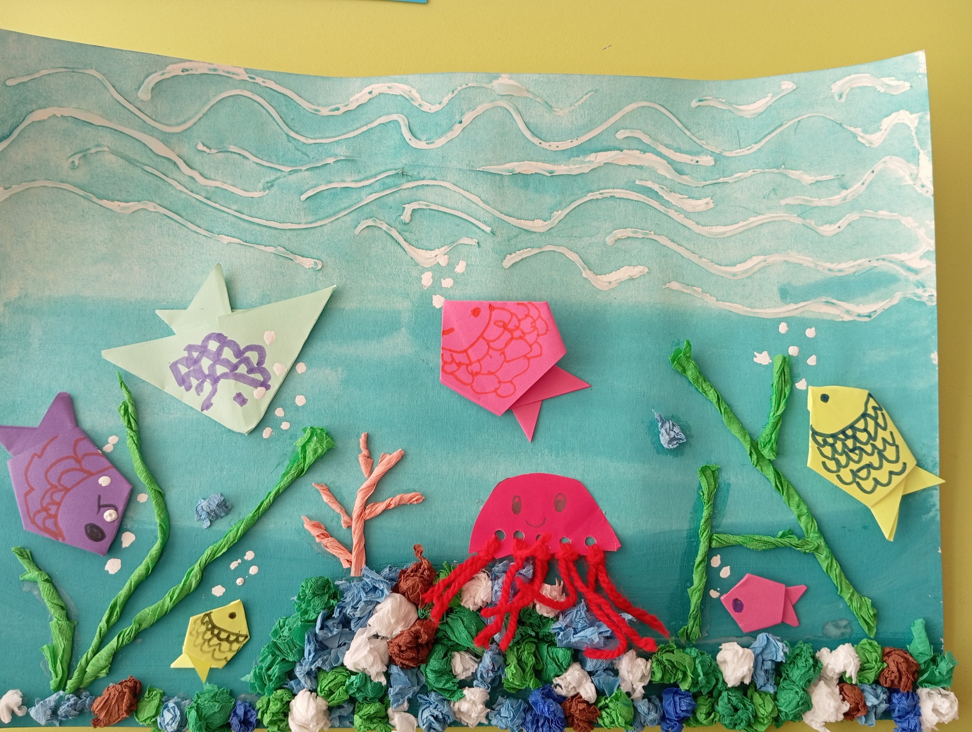 Origami zivis, karsta līme(viļņi), tonēšana ar guaša krāsam, kreppapīrs burzīšana(akmeņi un aļģes), astokājis- darbs ar diegiem.