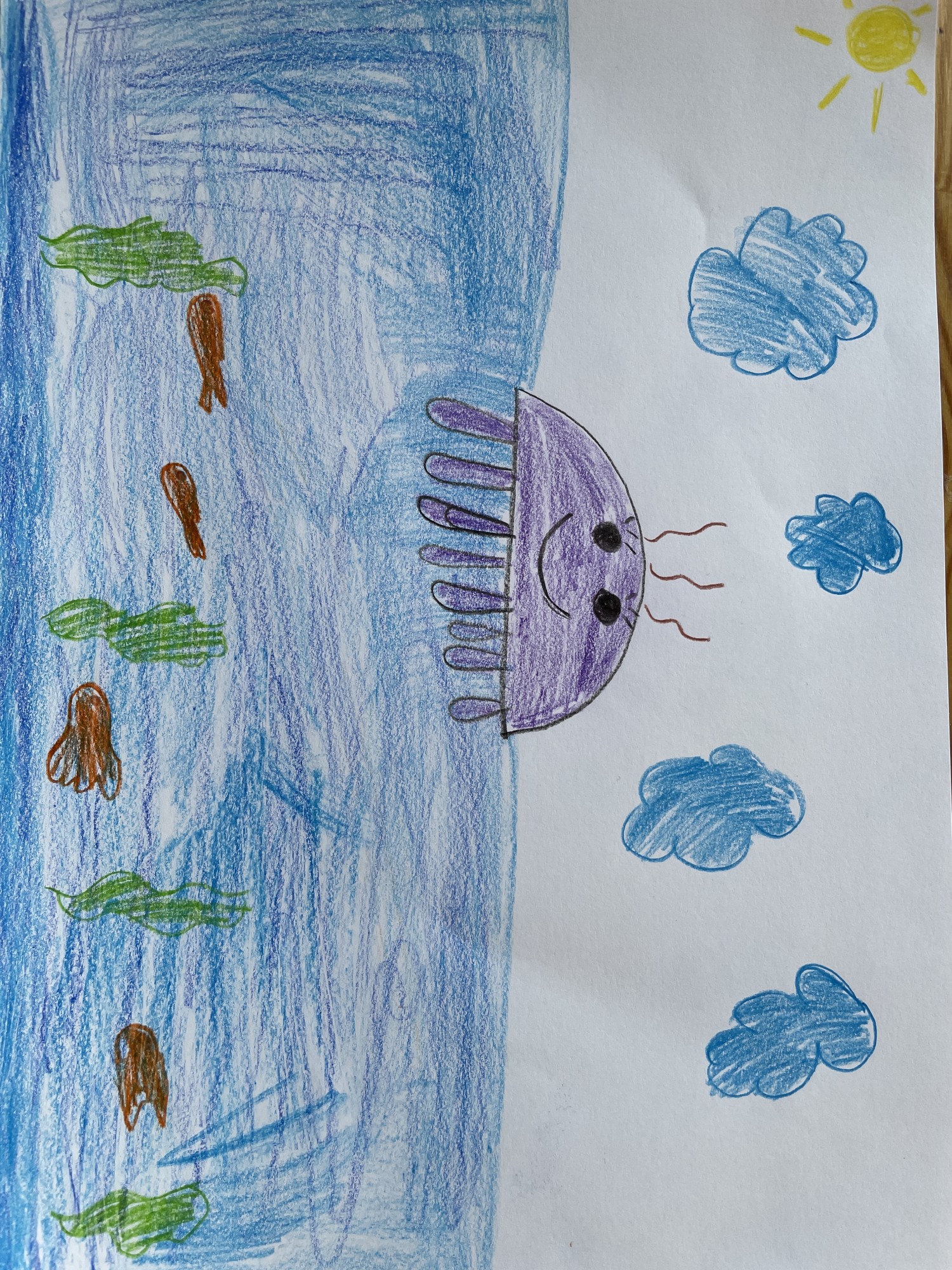 Medūza skatās uz zivīm, kuras spēlē paslēpes.