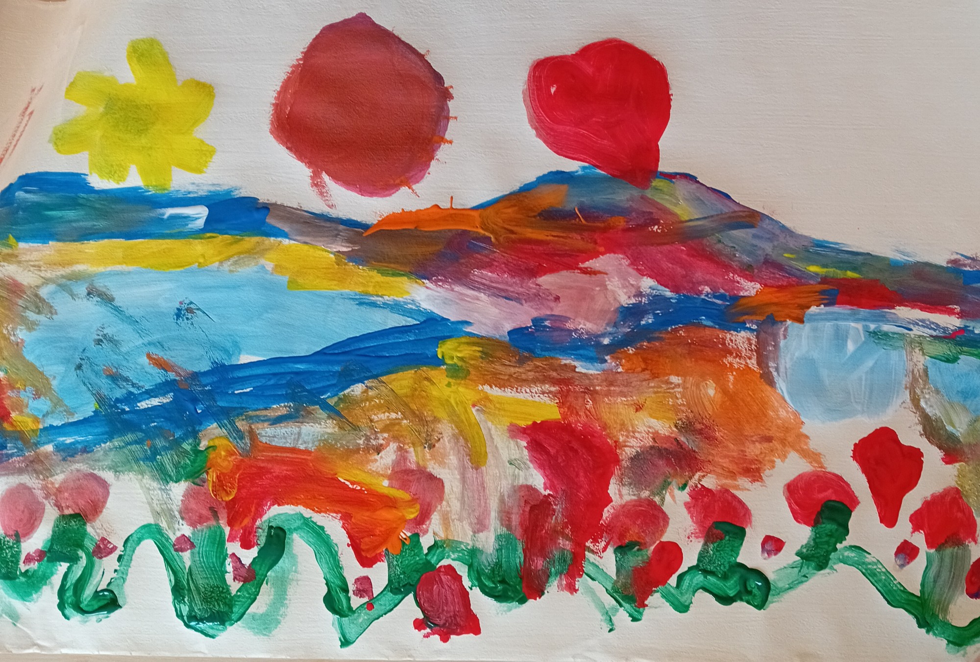 Bērni ir attēlojuši vulkāna izvirdumu,ezerus,upi un ziedu pļavu kalna pakājē