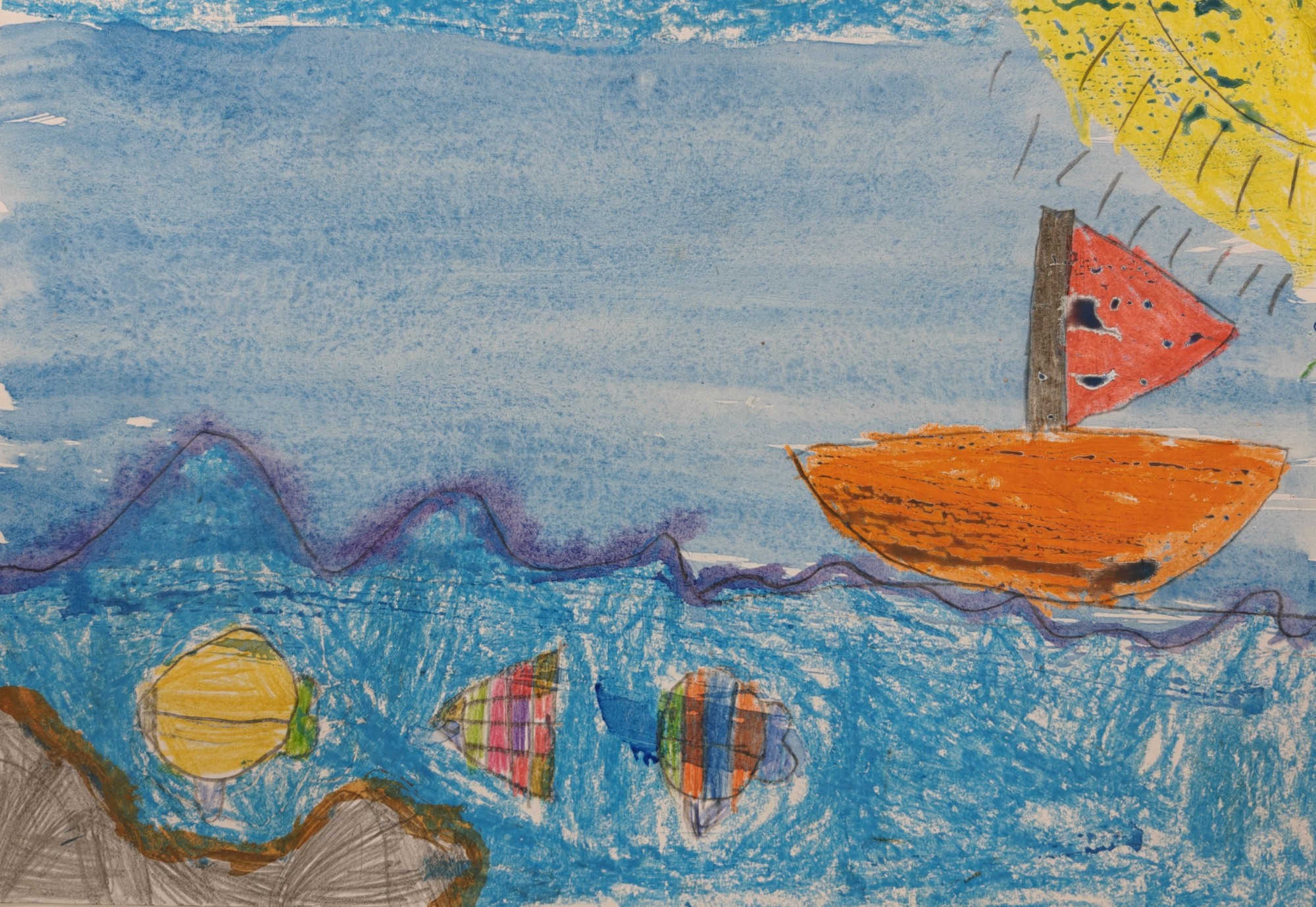 Saulainā dienā oranža laiviņa peld pa zilajiem viļņiem. Zem tās dzīvo krāsainas zivis, kas rotaļīgi šūpojas ūdenī.