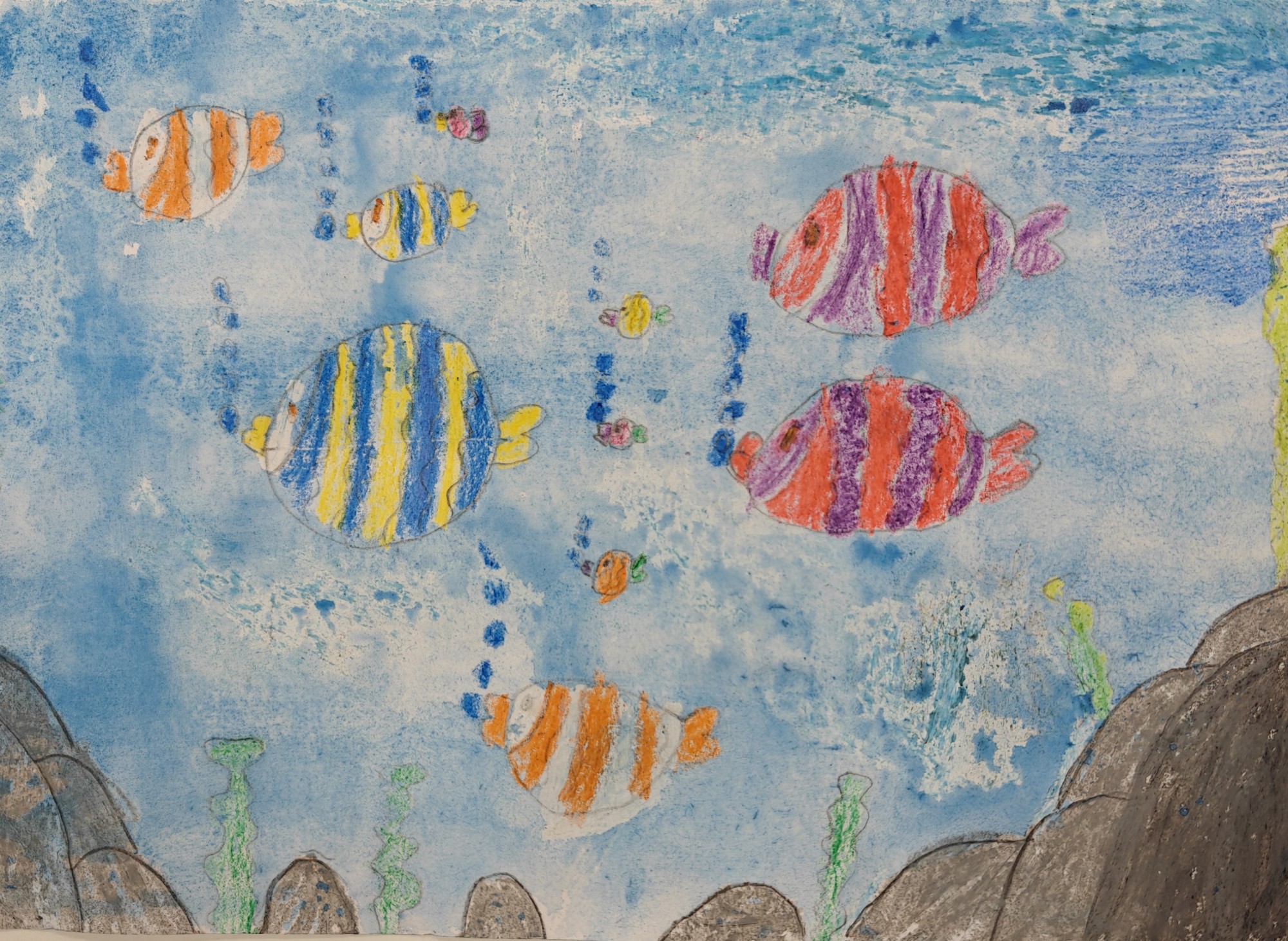 Zilajā jūras pasaulē jautri peld strīpainas zivis. Tās pļāpā burbulīšos un kopā izpēta savu krāsaino jūras māju.
