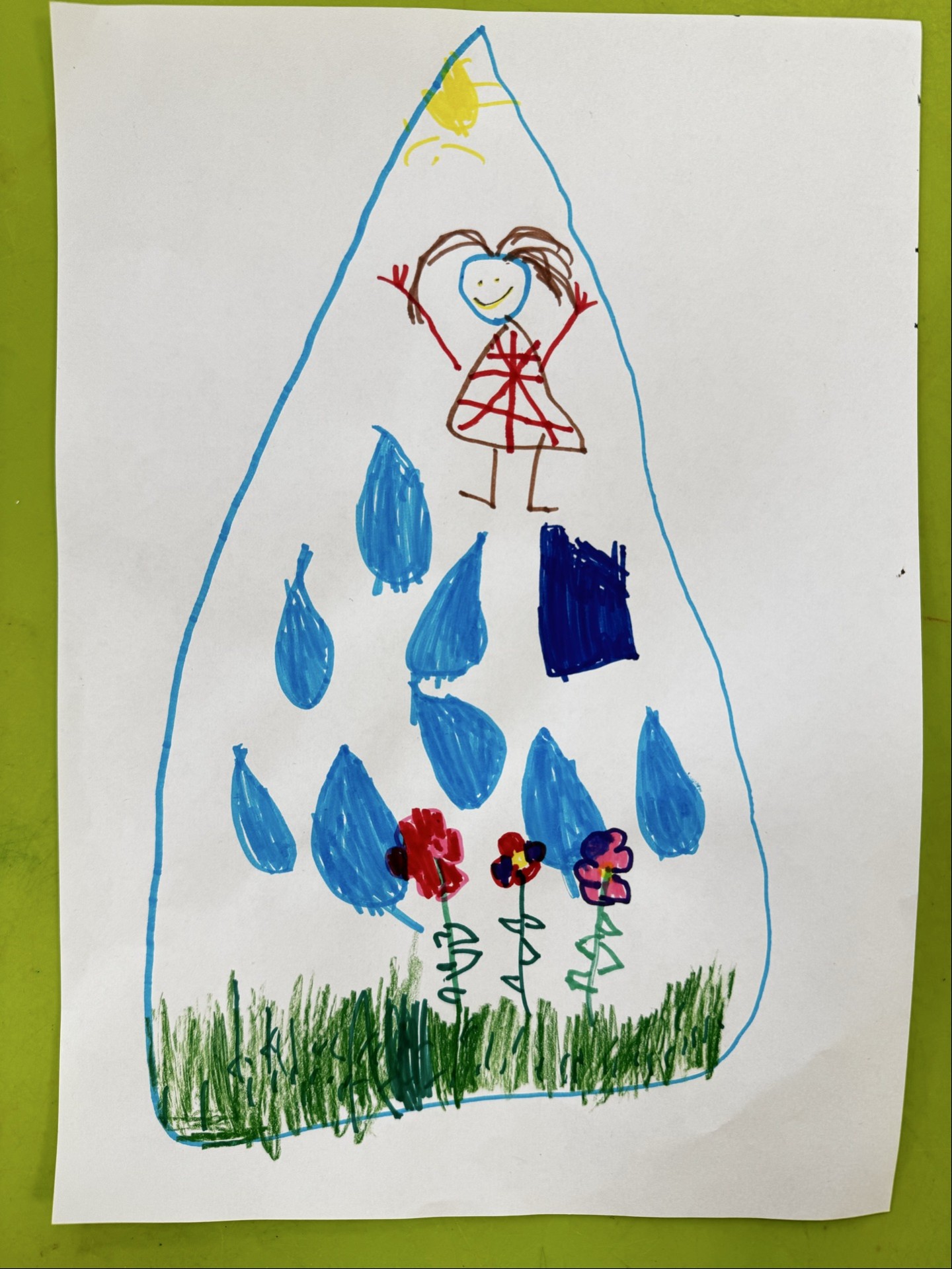 Zīmējuma autore pilītē ir uzzīmējusi sevi, priecīgu, jo ūdens dod mums enerģiju un prieku, kā arī ūdens pilītes, kuras krīt uz puķēm un zāli, kuras neizaugtu bez ūdens. Ūdens ir nepieciešams visapkārt mūsu pasaulei, katrai dzīvībai.