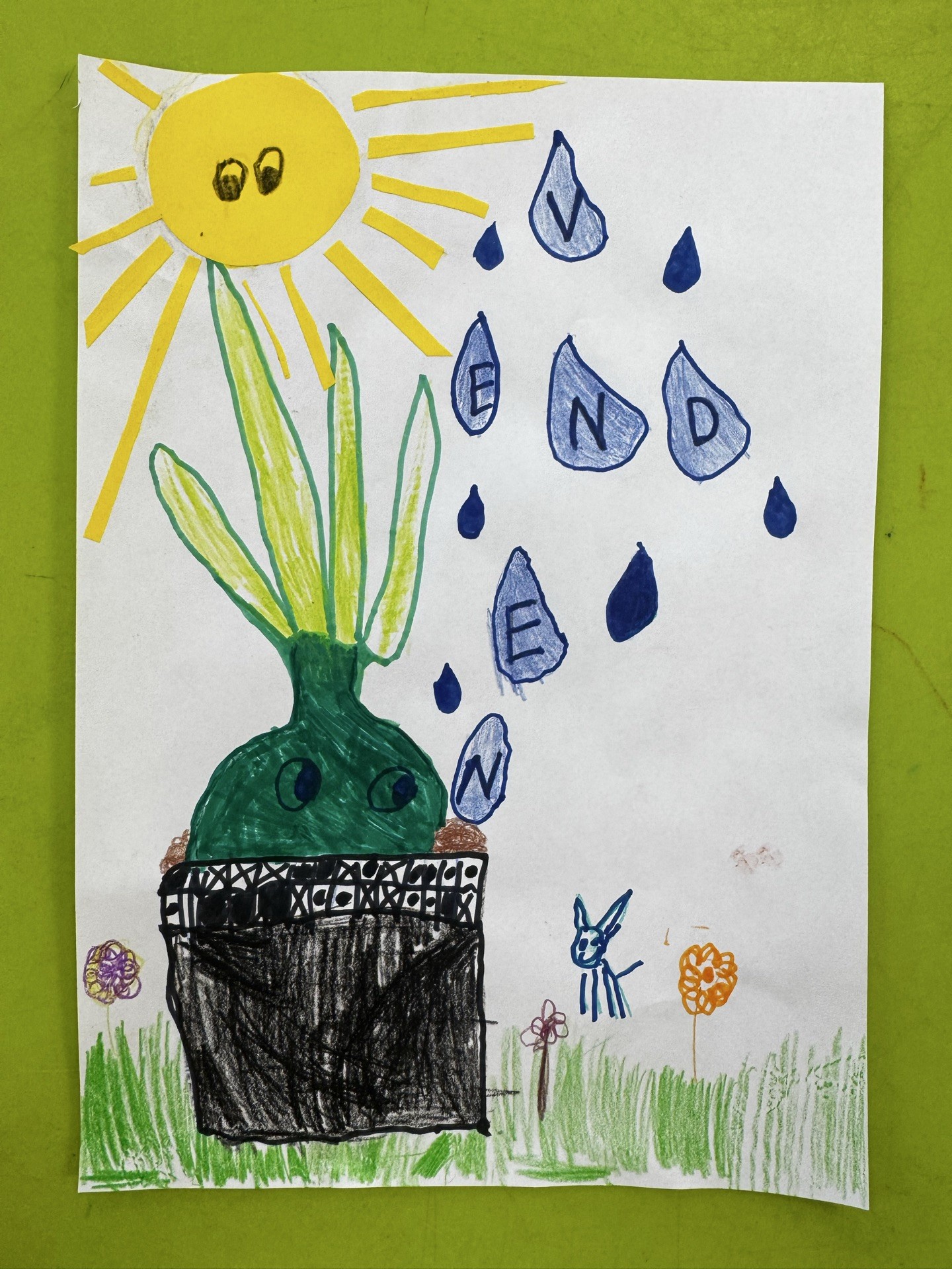 Polina darbā ir attēlojusi sīpoliņu, no kura izaug loki un tas nebūtu iespējams , ja lociņus mēs nelaistītu ar ūdeni. Sīpoliņš skatās uz ūdens lāsītēm ar cerību, ka tās iekritīs viņa podiņā.