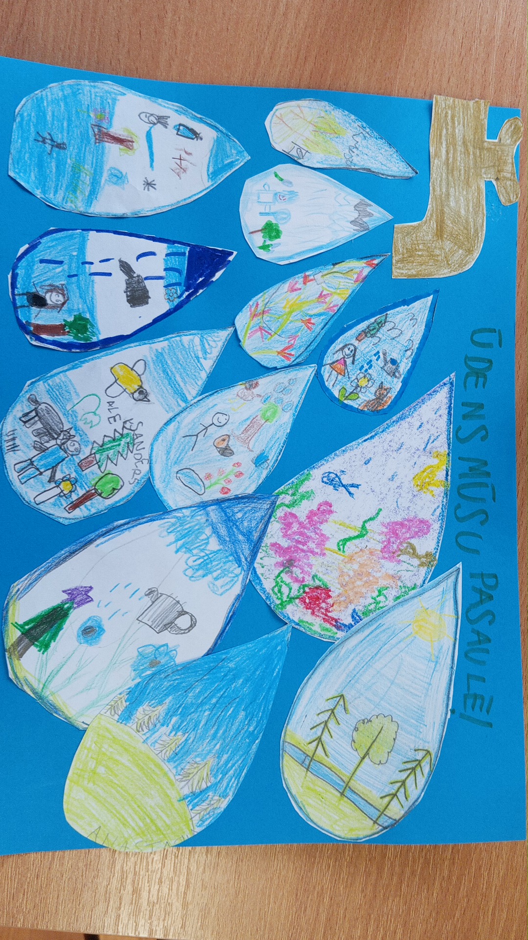 Bērni zīmēja ūdens pilītes un krānu par doto tēmu, pec tam tās izgrieza, un visu pielīmēja kopīgā kompozīcijā.