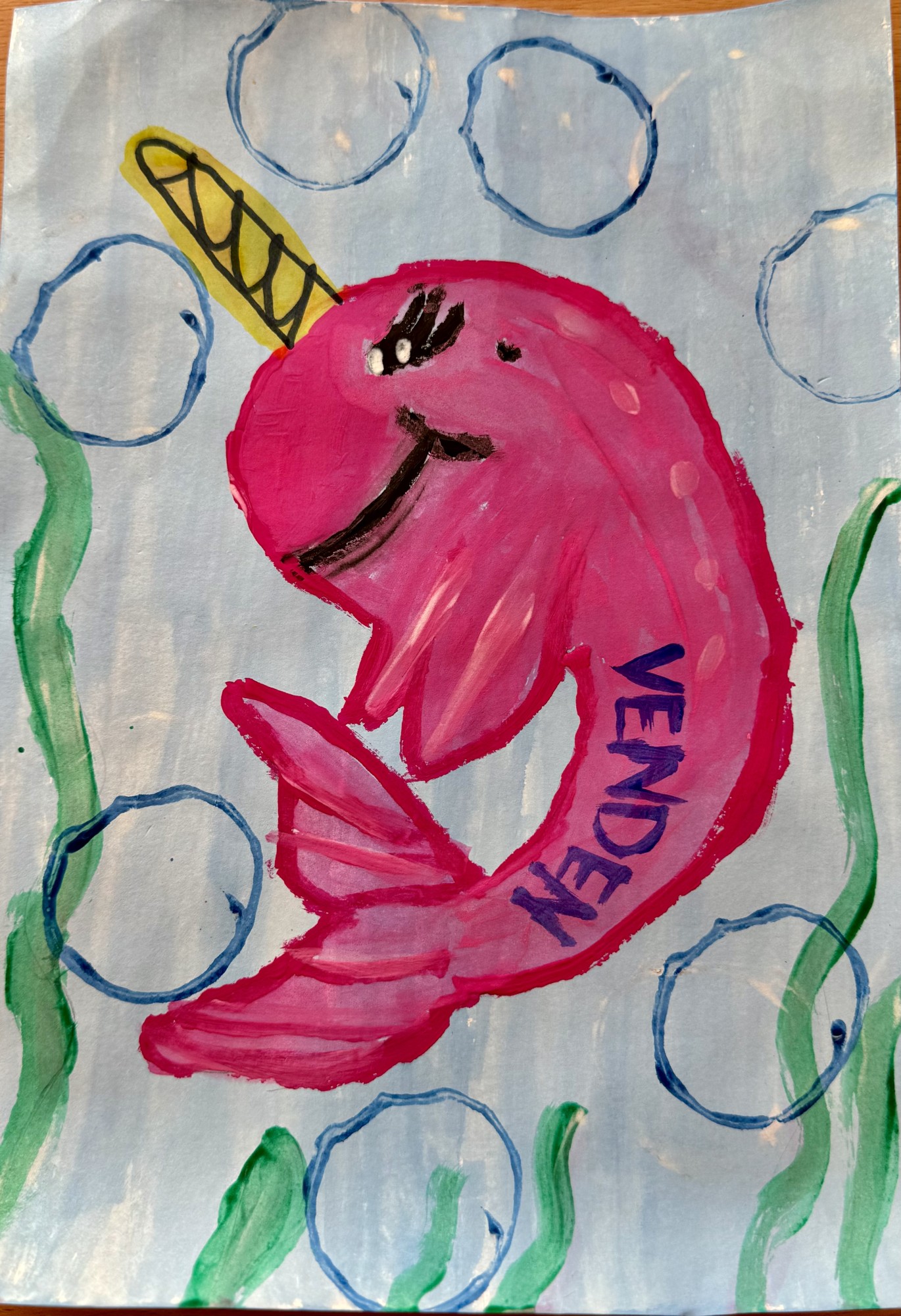 Zīmējumā attēlots jautrs jūras vienradzītis - VENDEN, kas dzīvo zemūdens pasaulē starp aļģēm un burbulīšiem. Viņa ir draudzīga un sargā jūras iemītniekus.