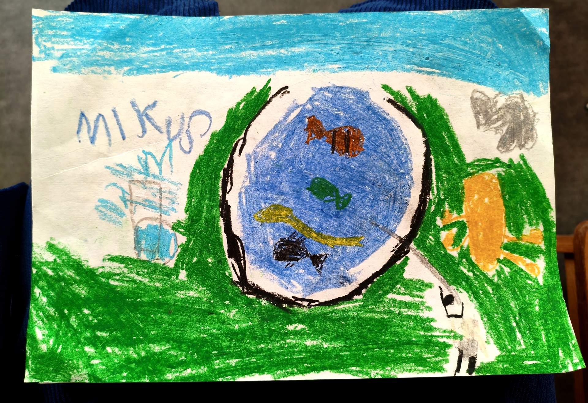 Dīķis ar makšķernieku, kurš makšķerē elektrisko zuti, Nemo zivi un citas zivis