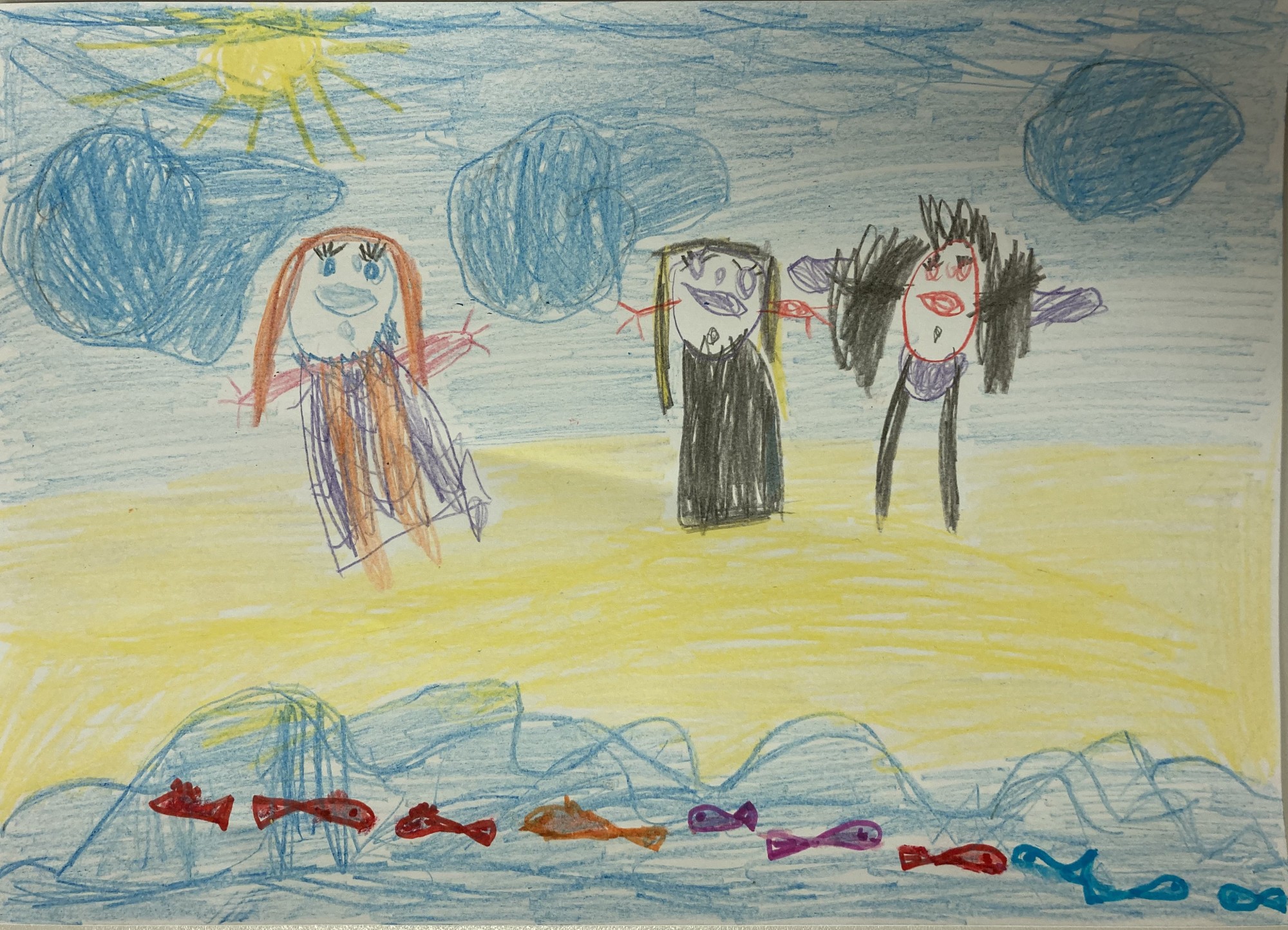 Mana ģimene jūrā, kur peld krāsainas zivtiņas.