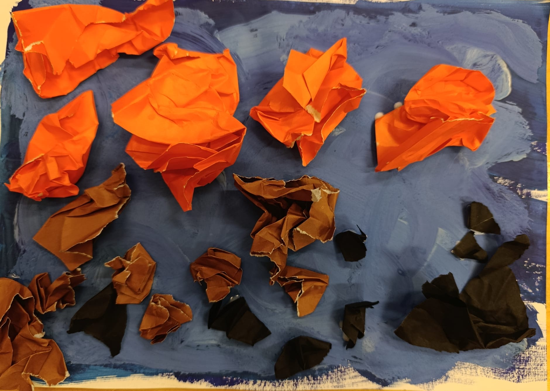 Bērni ar guaša krāsu krāsoja fonu- dažādos zilos toņos. Aktīvākie bērni plēsa un burzīja aplikācijas papīru, ko pielīmēja pie notonētās lapas. Krāsainas zivtiņas dzīvo un peld ūdenī.
