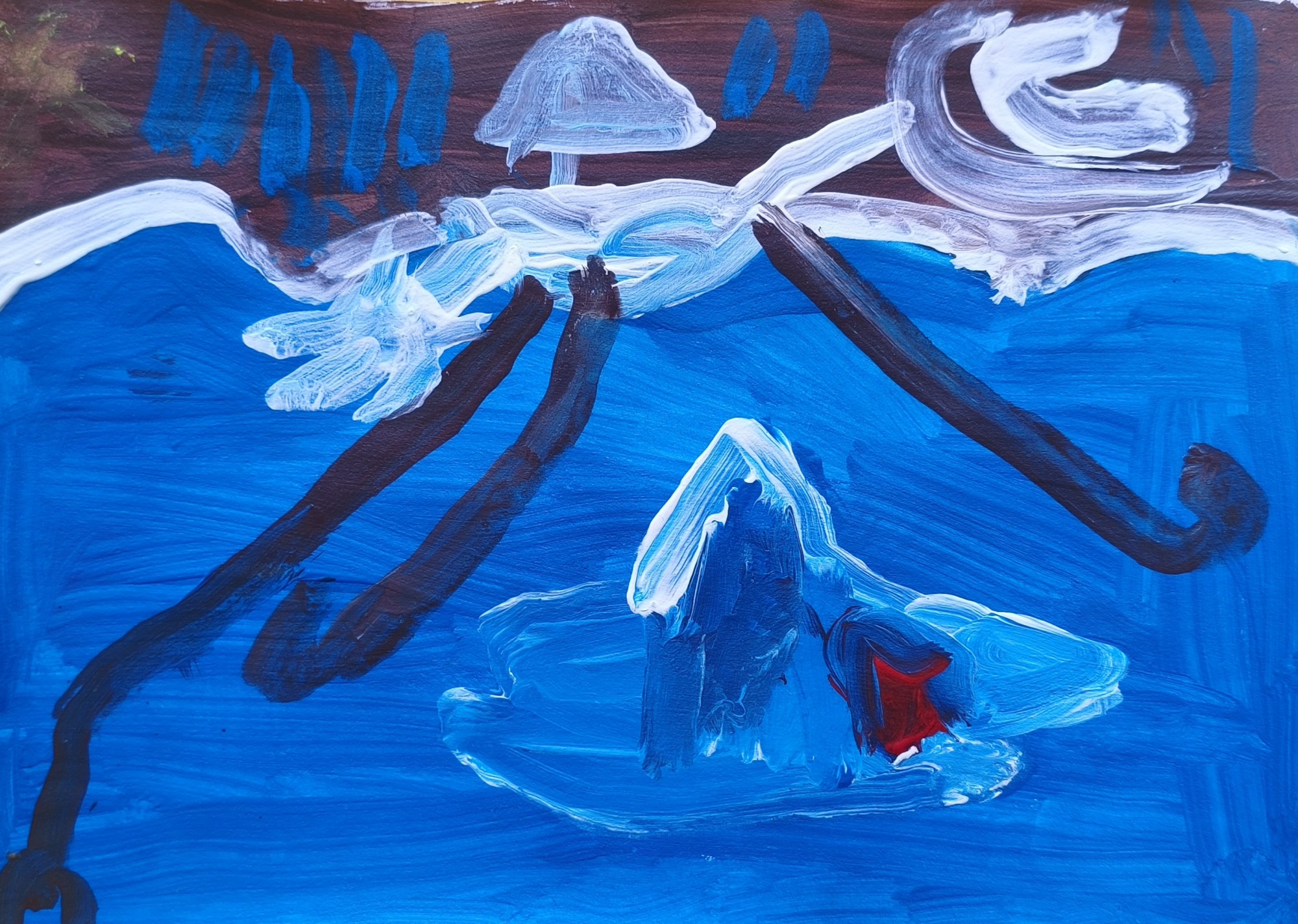 Zīmējumā dzīvo maza haizivīte, kas peld zilajā jūrā. Haizivīte ziņkārīgi pēta jūru un tās noslēpumus.