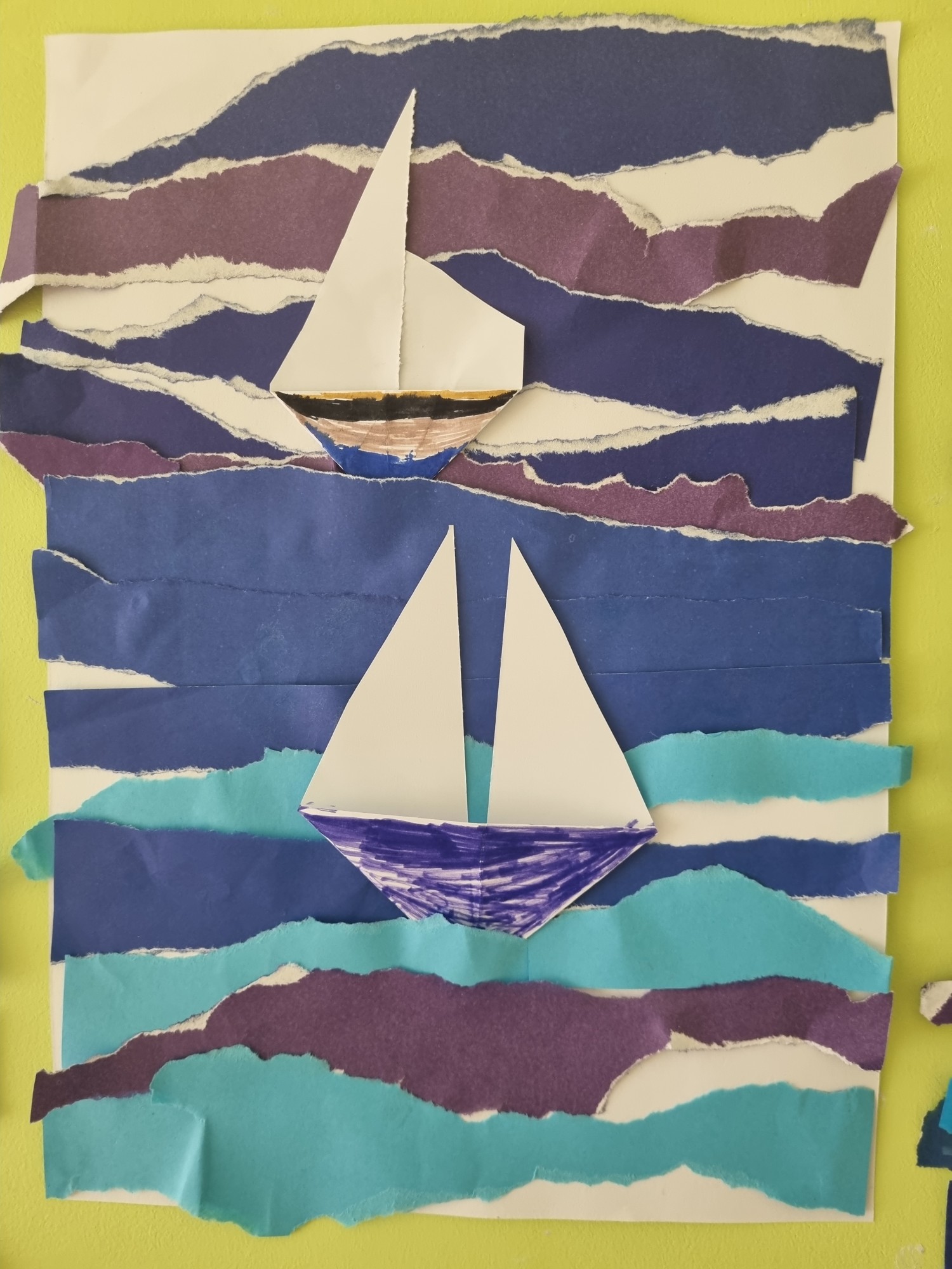 Darbiņš plēšanas tehnikā, papildināts ar aplicējumu.