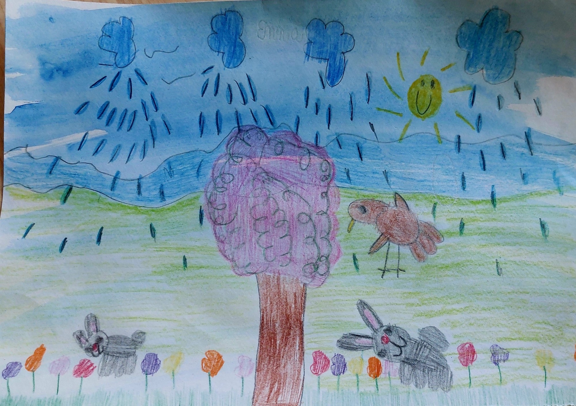 A4 formāta lapa, fons noklāts ar ūdenskrāsām, zīmēts ar krāsainajiem zīmuļiem.
