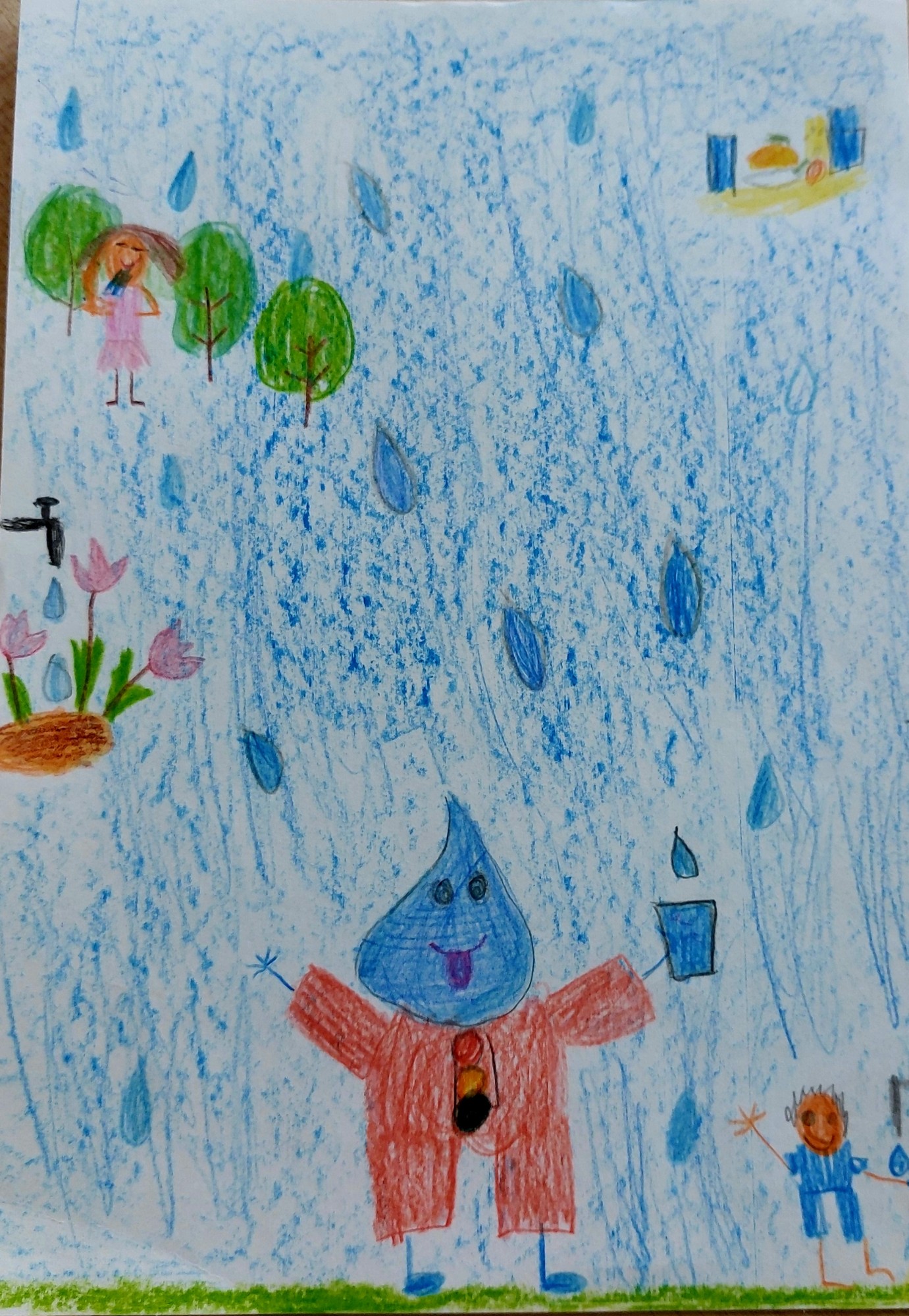 A4 formāta lapa, fons noklāts ar vaska krītiņiem, zīmēts ar zīmuļkrāsām.