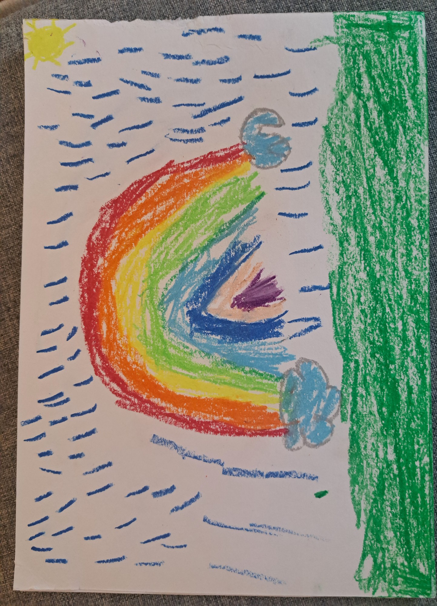 Lietus pilītes krīt un saulīte pasmaida. Tad debesīs parādās liela krāsaina varavīksne.