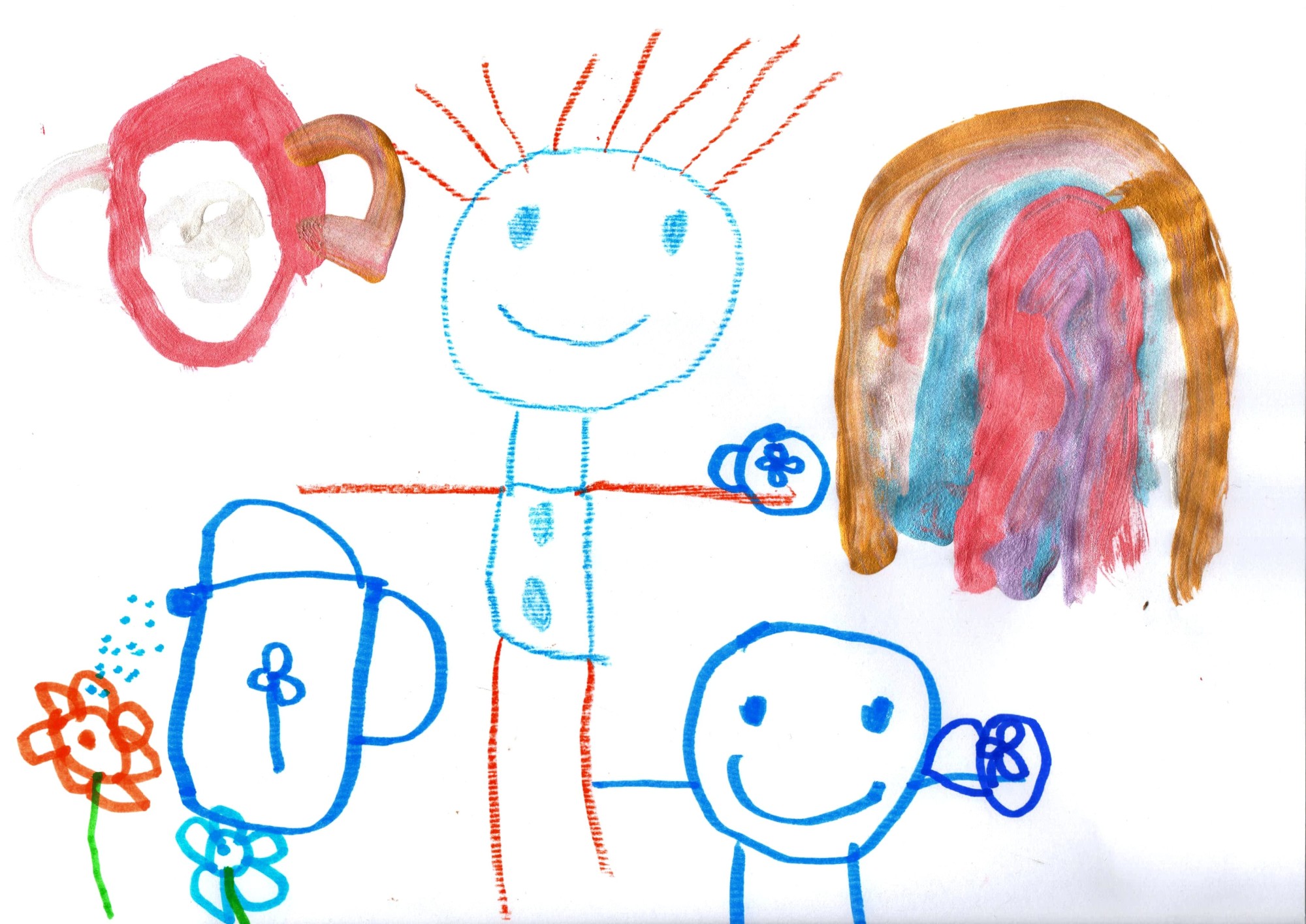 Estere zina, ka ūdens ir veselīgs un tas ir jādzer, tāpēc savā zīmējumā attēlo, kā ar savu brālīti to dzer no savām vismīļākajām krūzēm. Arī puķēm nepieciešams ūdens, lai tās augtu skaistas, un mums jārūpējas tās aplaistīt. Visvairāk par visu prieku sagādā varavīksnes ieraudzīšana pēc lietus.