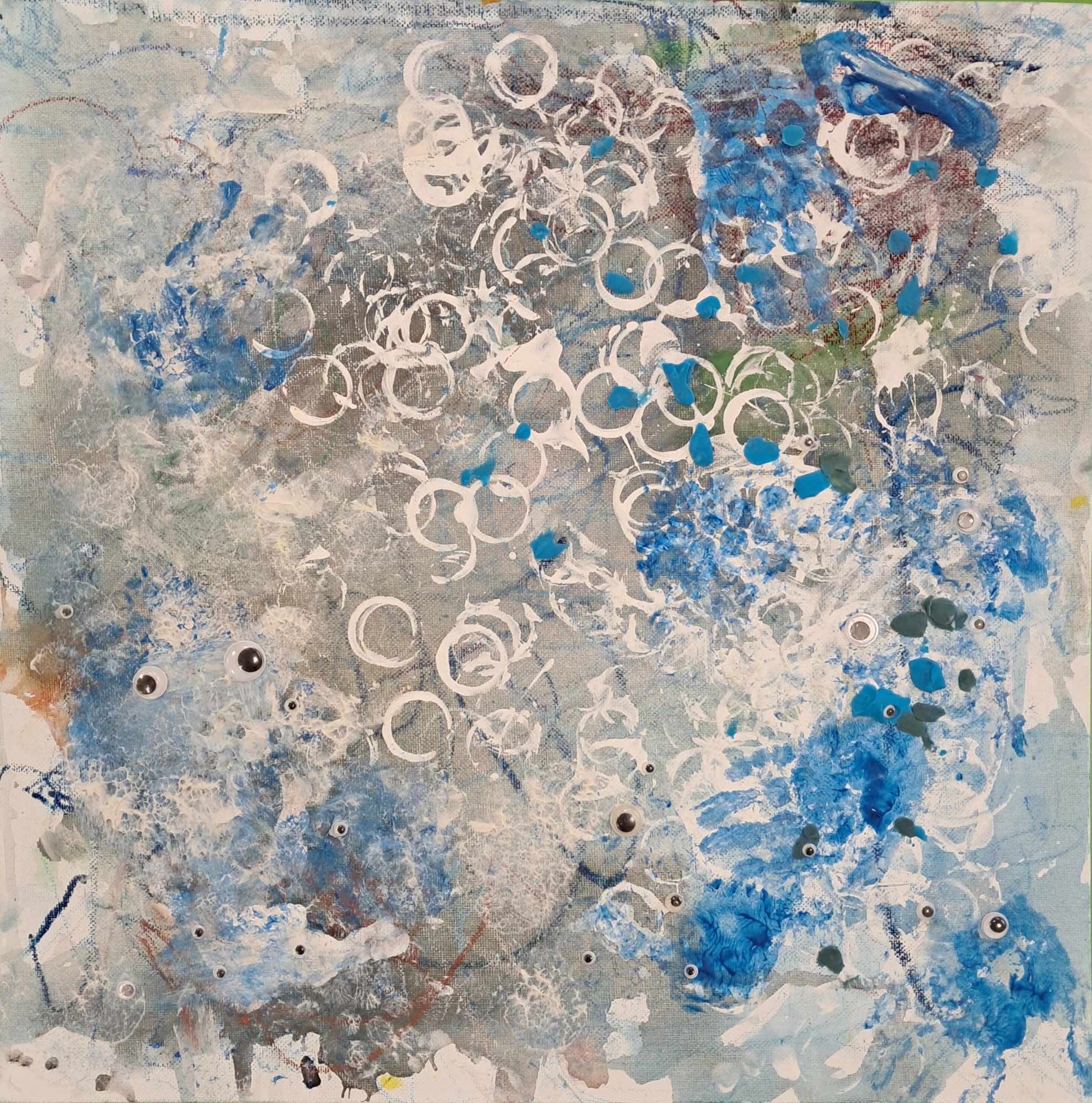 Februāra tēmas "Vesels un draudzīgs" ietvaros (ar rotaļām, dziesmām un radošiem eksperimentiem) iepazinām roku mazgāšanas nepieciešamību. Šajā darbā bērni izmantoja dažādas tehnikas, lai atveidotu procesus, kas saistās ar roku mazgāšanu – sākumā ar pasteļkrītiņiem zīmēja līnijas un spirāles (kā tek ūdens), citā dienā papildināja darbu ar ūdenskrāsām, pēctam ar pudelēm un korķiem spieda baltus riņkus (atveido burbuļus, kas rodas ziepes saputojot ūdenī), noslēgumā darbs tika papildināts ar roku nospiedumiem, plastilīnu un kustīgajām acīm (mikrobi bēg no ziepēm). Darba formāts tika izraudzīts 40x40 cm, lai vienlaicīgi pie tā var strādāt vairāki bērni.